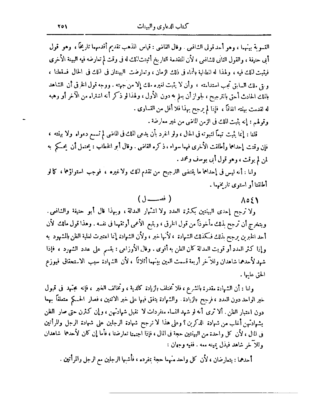 (٨٥١٠) فَصْلٌ: وَلَا تُرَجَّحُ إحْدَى الْبَيِّنَتَيْنِ بِكَثْرَةِ الْعَدَدِ، وَلَا اشْتِهَارِ الْعَدَالَةِ. وَبِهَذَا قَالَ أَبُو حَنِيفَةَ، وَالشَّافِعِيُّ. وَيَتَخَرَّجُ أَنَّ تُرَجَّحَ بِذَلِكَ، مَأْخُوذًا مِنْ قَوْلِ الْخِرَقِيِّ: وَيَتَّبِعُ الْأَعْمَى أَوْثَقَهُمَا فِي نَفْسِهِ. وَهَذَا قَوْلُ مَالِكٍ؛ لِأَنَّ أَحَدَ الْخَبَرَيْنِ يُرَجَّحُ بِذَلِكَ، فَكَذَلِكَ الشَّهَادَةُ، لِأَنَّهَا خَبَرٌ، وَلِأَنَّ الشَّهَادَةَ إنَّمَا اُعْتُبِرَتْ لِغَلَبَةِ الظَّنِّ بِالْمَشْهُودِ بِهِ، وَإِذَا كَثُرَ الْعَدَدُ أَوْ قَوِيَتْ الْعَدَالَةُ، كَانَ الظَّنُّ بِهِ أَقْوَى. وَقَالَ الْأَوْزَاعِيُّ: يُقْسَمُ عَلَى عَدَدِ الشُّهُودِ، فَإِذَا شَهِدَ لِأَحَدِهِمَا شَاهِدَانِ، وَلِلْآخَرِ أَرْبَعَةٌ، قَسَمَتْ الْعَيْنُ بَيْنَهُمَا أَثْلَاثًا؛ لِأَنَّ الشَّهَادَةَ سَبَبُ الِاسْتِحْقَاقِ، فَيُوَزَّعُ الْحَقُّ عَلَيْهَا.