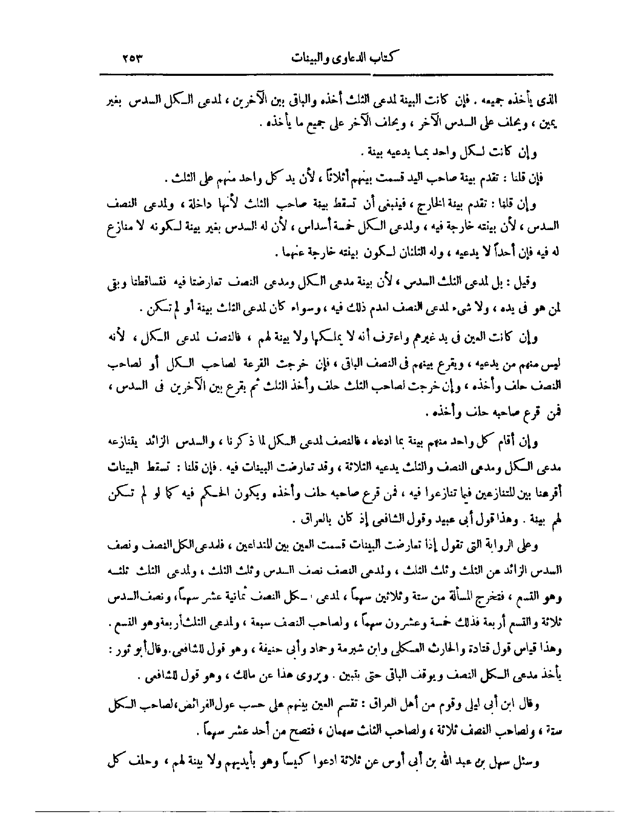 وَقَالَ ابْنُ أَبِي لَيْلَى وَقَوْمٌ مِنْ أَهْلِ الْعِرَاقِ: تُقْسَمُ الْعَيْنُ بَيْنَهُمْ عَلَى حَسَبِ عَوْلِ الْفَرَائِضِ، لِصَاحِبِ الْكُلِّ سِتَّةٌ، وَلِصَاحِبِ النِّصْفِ ثَلَاثَةٌ، وَلِصَاحِبِ الثُّلُثِ سَهْمَانِ، فَتَصِحُّ مِنْ أَحَدَ عَشَرَ سَهْمًا. وَسُئِلَ سَهْلُ بْنُ عَبْدِ اللَّهِ بْنِ أَبِي أَوْسٍ عَنْ ثَلَاثَةٍ ادَّعَوْا كِيسًا وَهُوَ بِأَيْدِيهِمْ، وَلَا بَيِّنَةَ لَهُمْ، وَحَلَفَ كُلُّ
