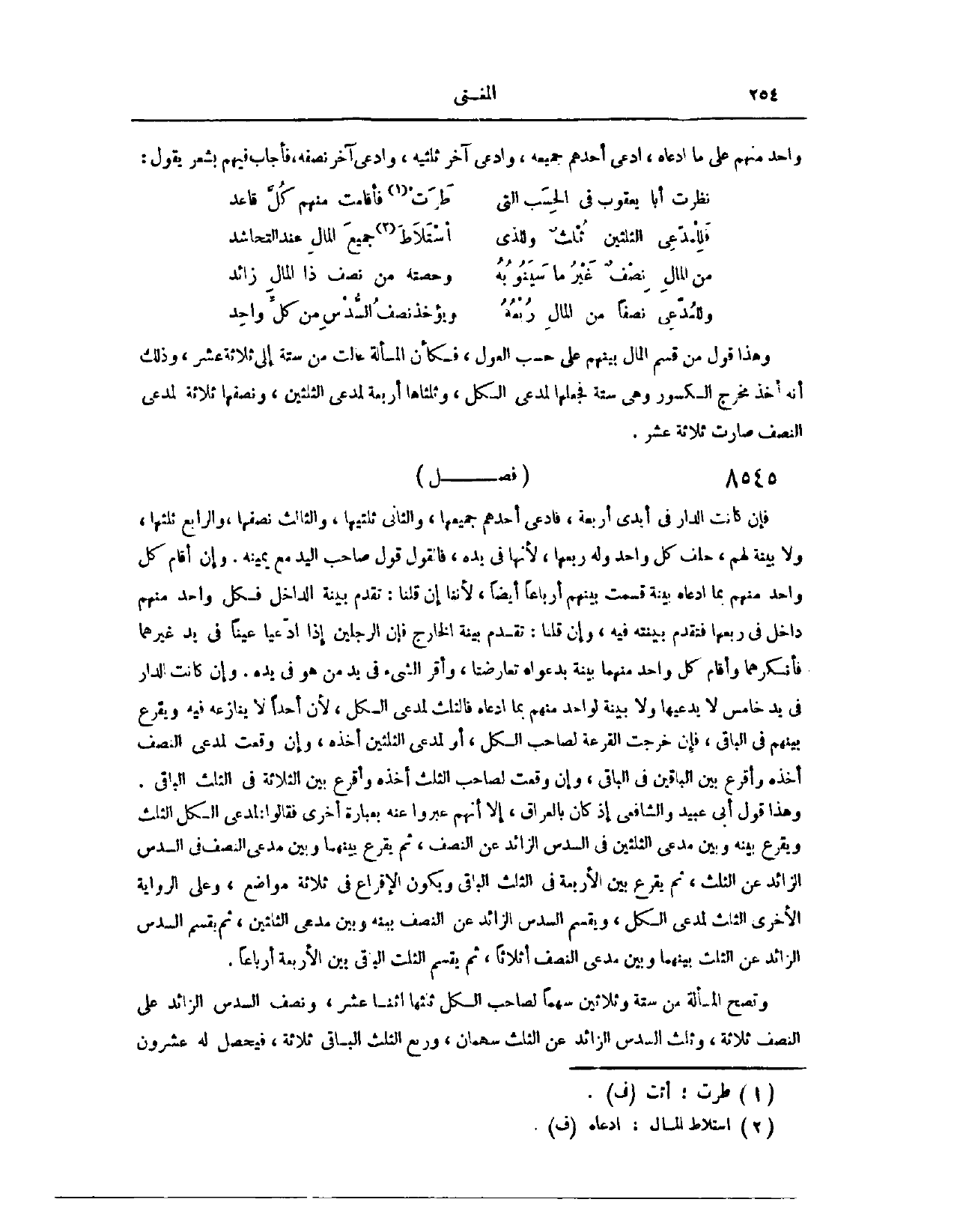 وَاحِدٍ مِنْهُمْ عَلَى مَا ادَّعَاهُ؛ ادَّعَى أَحَدُهُمْ جَمِيعَهُ، وَادَّعَى آخَرُ ثُلُثَيْهِ، وَادَّعَى آخَرُ نِصْفَهُ؟ فَأَجَابَ فِيهِمْ بِشِعْرٍ: يَقُولُ