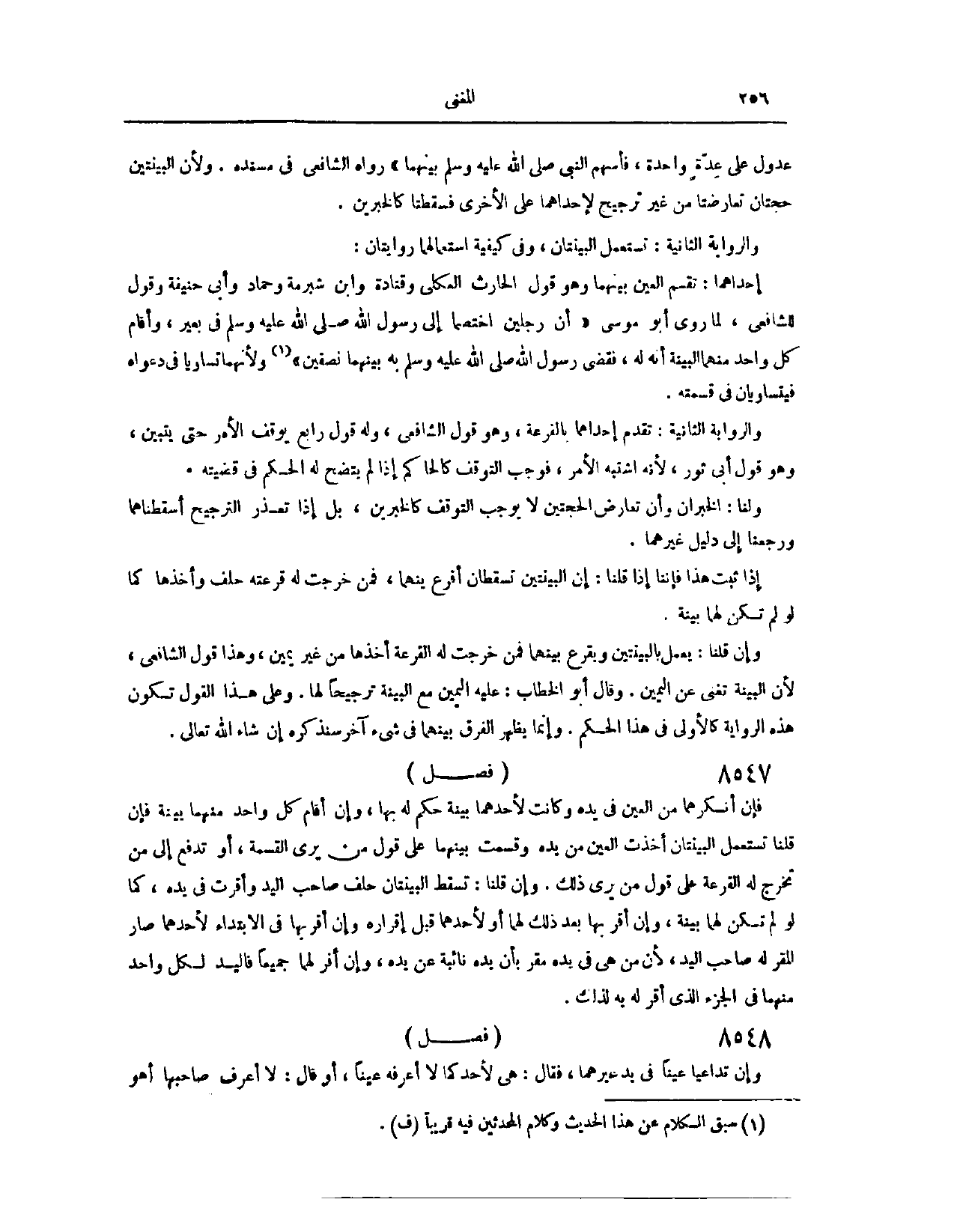 عُدُولٍ، عَلَى عِدَّةٍ وَاحِدَةٍ فَأَسْهَمَ النَّبِيُّ - صَلَّى اللَّهُ عَلَيْهِ وَسَلَّمَ - بَيْنَهُمَا» . رَوَاهُ الشَّافِعِيُّ، فِي " مُسْنَدِهِ ". وَلِأَنَّ الْبَيِّنَتَيْنِ حُجَّتَانِ تَعَارَضَتَا، مِنْ غَيْرِ تَرْجِيحٍ لِإِحْدَاهُمَا عَلَى الْأُخْرَى، فَسَقَطَتَا، كَالْخَبَرَيْنِ. وَالرِّوَايَةُ الثَّانِيَةُ، تُسْتَعْمَلُ الْبَيِّنَتَانِ. وَفِي كَيْفِيَّةِ اسْتِعْمَالِهِمَا رِوَايَتَانِ؛ إحْدَاهُمَا، تُقْسَمُ الْعَيْنُ بَيْنَهُمَا. وَهُوَ قَوْلُ الْحَارِثِ الْعُكْلِيِّ، وَقَتَادَةَ، وَابْنِ شُبْرُمَةَ، وَحَمَّادٍ، وَأَبِي حَنِيفَةَ، وَقَوْلٌ لِلشَّافِعِيِّ؛ لِمَا رَوَى أَبُو مُوسَى، «أَنَّ رَجُلَيْنِ اخْتَصَمَا إلَى رَسُولِ اللَّهِ - صَلَّى اللَّهُ عَلَيْهِ وَسَلَّمَ - فِي بَعِيرٍ، وَأَقَامَ كُلُّ وَاحِدٍ مِنْهُمَا الْبَيِّنَةَ أَنَّهُ لَهُ؛ فَقَضَى رَسُولُ اللَّهِ - صَلَّى اللَّهُ عَلَيْهِ وَسَلَّمَ - بِهِ بَيْنَهُمَا نِصْفَيْنِ» .