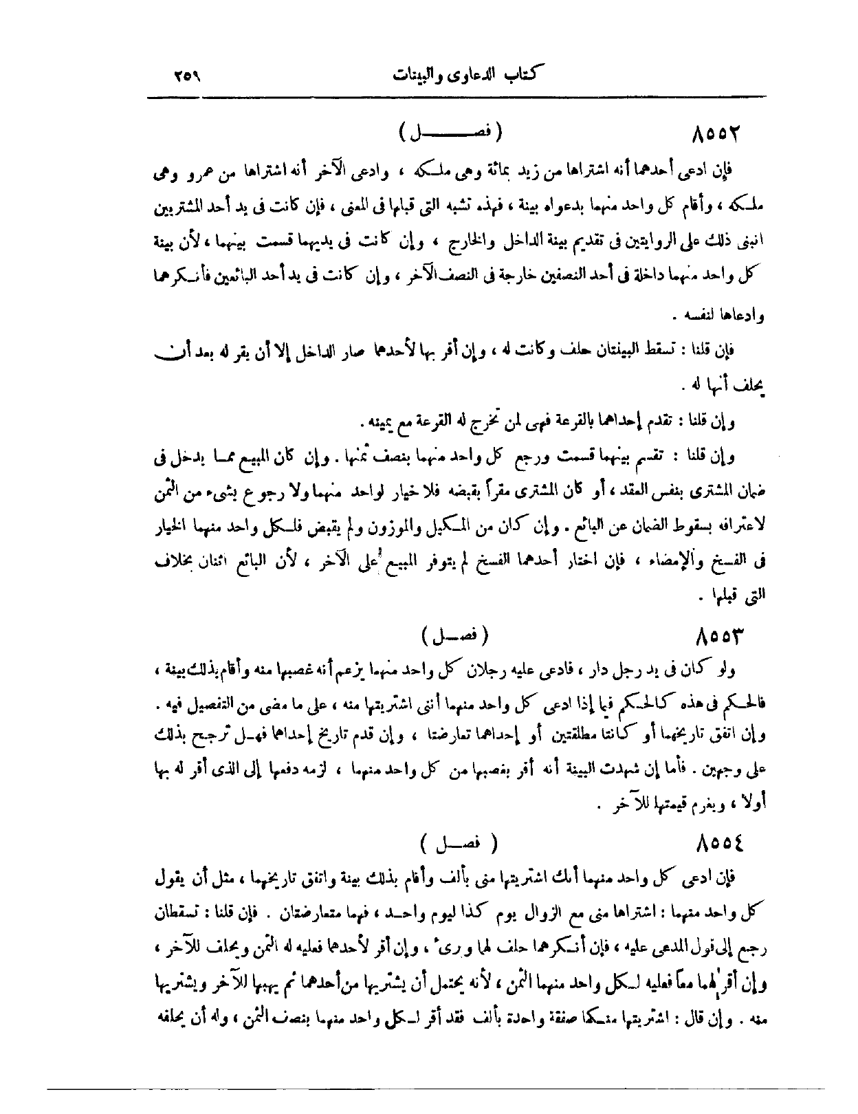 (٨٥٢٣) فَصْلٌ: فَإِنْ ادَّعَى كُلُّ وَاحِدٍ مِنْهُمَا أَنَّك اشْتَرَيْتهَا مِنِّي بِأَلْفٍ، وَأَقَامَ بِذَلِكَ بَيِّنَةً، وَاتَّفَقَ تَارِيخُهُمَا، مِثْلُ أَنْ يَقُولَ كُلُّ وَاحِدٍ مِنْهُمَا: اشْتَرَاهَا مِنِّي مَعَ الزَّوَالِ، يَوْمَ كَذَا لَيَوْمٍ وَاحِدٍ، فَهُمَا مُتَعَارِضَتَانِ. فَإِنْ قُلْنَا: تَسْقُطَانِ. رُجِعَ إلَى قَوْلِ الْمُدَّعَى عَلَيْهِ، فَإِنْ أَنْكَرْهُمَا، حَلَفَ لَهُمَا، وَبَرِئَ. وَإِنْ أَقَرَّ لِأَحَدِهِمَا، فَعَلَيْهِ لَهُ الثَّمَنُ، وَيَحْلِفُ لِلْآخَرِ. وَإِنْ أَقَرَّ لَهُمَا مَعًا، فَعَلَيْهِ لِكُلِّ وَاحِدٍ مِنْهُمَا الثَّمَنُ؛ لِأَنَّهُ يَحْتَمِلُ أَنْ يَشْتَرِيَهَا مِنْ أَحَدِهِمَا، ثُمَّ يَهَبَهَا لِلْآخَرِ وَيَشْتَرِيَهَا مِنْهُ. وَإِنْ قَالَ: اشْتَرَيْتهَا مِنْكُمَا صَفْقَةً وَاحِدَةً بِأَلْفٍ. فَقَدْ أَقَرَّ لِكُلِّ وَاحِدٍ مِنْهُمَا بِنِصْفِ الثَّمَنِ، وَلَهُ أَنْ يُحَلِّفَهُ