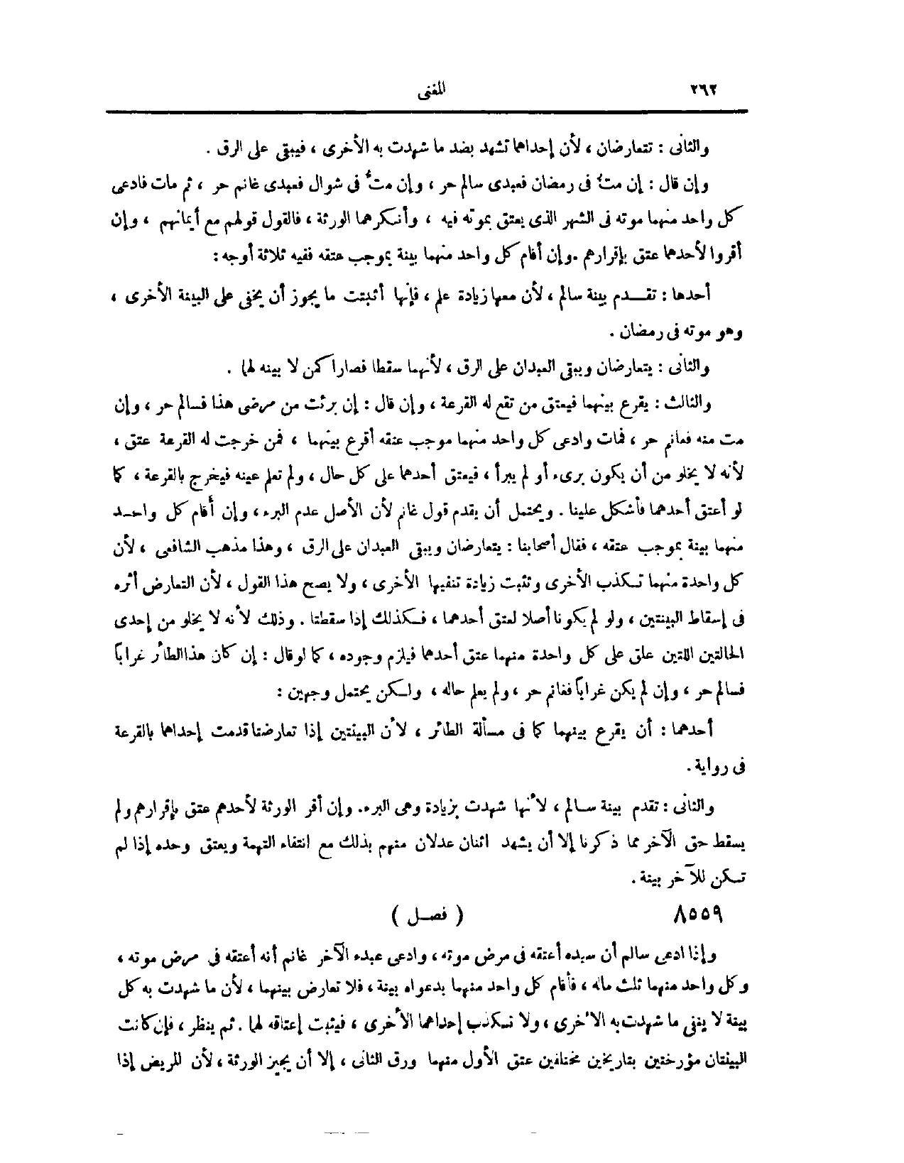 (٨٥٢٨) فَصْلٌ: وَإِذَا ادَّعَى سَالِمٌ أَنَّ سَيِّدَهُ أَعْتَقَهُ فِي مَرَضِ مَوْتِهِ، وَادَّعَى عَبْدُهُ الْآخَرُ غَانِمٌ أَنَّهُ أَعْتَقَهُ فِي مَرَضِ مَوْتِهِ، وَكُلُّ وَاحِدٍ مِنْهُمَا ثُلُثُ مَالِهِ، فَأَقَامَ كُلُّ وَاحِدٍ مِنْهُمَا بِدَعْوَاهُ بَيِّنَةً فَلَا تَعَارُضَ بَيْنَهُمَا؛ لِأَنَّ مَا شَهِدَتْ بِهِ كُلُّ بَيِّنَةٍ لَا يَنْفِي مَا شَهِدَتْ بِهِ الْأُخْرَى، وَلَا تُكَذِّبُ إحْدَاهُمَا الْأُخْرَى، فَيَثْبُتُ إعْتَاقُهُ لَهُمَا، ثُمَّ يُنْظَرُ، فَإِنْ كَانَتْ الْبَيِّنَتَانِ مُؤَرِّخَتَيْنِ بِتَارِيخَيْنِ مُخْتَلِفَيْنِ، عَتَقَ الْأَوَّلُ مِنْهُمَا. وَرَقَّ الثَّانِي، إلَّا أَنْ يُجِيزَ الْوَرَثَةُ، لِأَنَّ الْمَرِيضَ إذَا