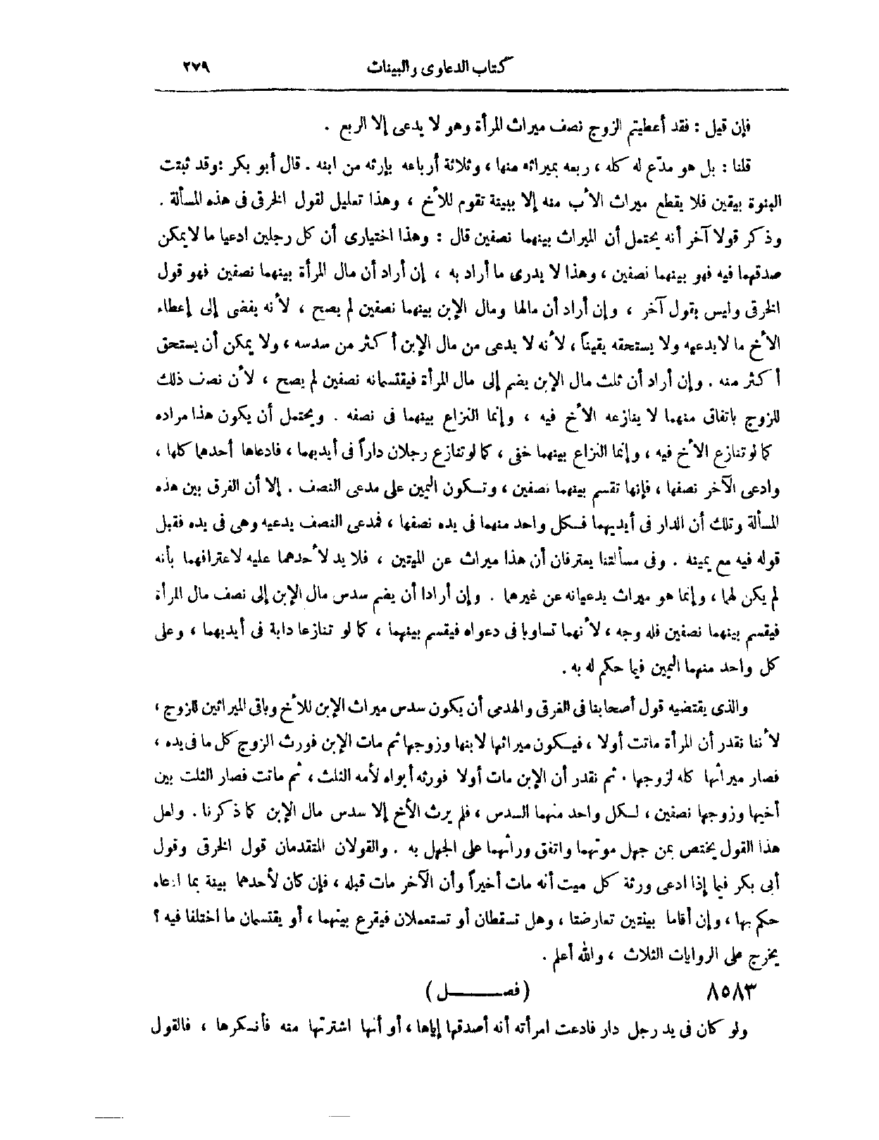 فَإِنْ قِيلَ: فَقَدْ أَعْطَيْتُمْ الزَّوْجَ نِصْفَ مِيرَاثِ الْمَرْأَةِ، وَهُوَ لَا يَدَّعِي إلَّا الرُّبْعَ قُلْنَا بَلْ هُوَ مُدَّعٍ لَهُ كُلِّهِ؛ رُبْعِهِ بِمِيرَاثِهِ مِنْهَا، وَثَلَاثَةِ أَرْبَاعِهِ بِإِرْثِهِ مِنْ ابْنِهِ. قَالَ أَبُو بَكْرٍ: وَقَدْ ثَبَتَتْ الْبُنُوَّةُ بِيَقِينٍ، فَلَا يُقْطَعُ مِيرَاثُ الْأَبِ مِنْهُ إلَّا بِبَيِّنَةٍ تَقُومُ لِلْأَخِ. وَهَذَا تَعْلِيلٌ لِقَوْلِ الْخِرَقِيِّ فِي هَذِهِ الْمَسْأَلَةِ. وَذَكَرَ قَوْلًا آخَرَ، أَنَّهُ يَحْتَمِلُ أَنَّ الْمِيرَاثَ بَيْنَهُمَا نِصْفَيْنِ.