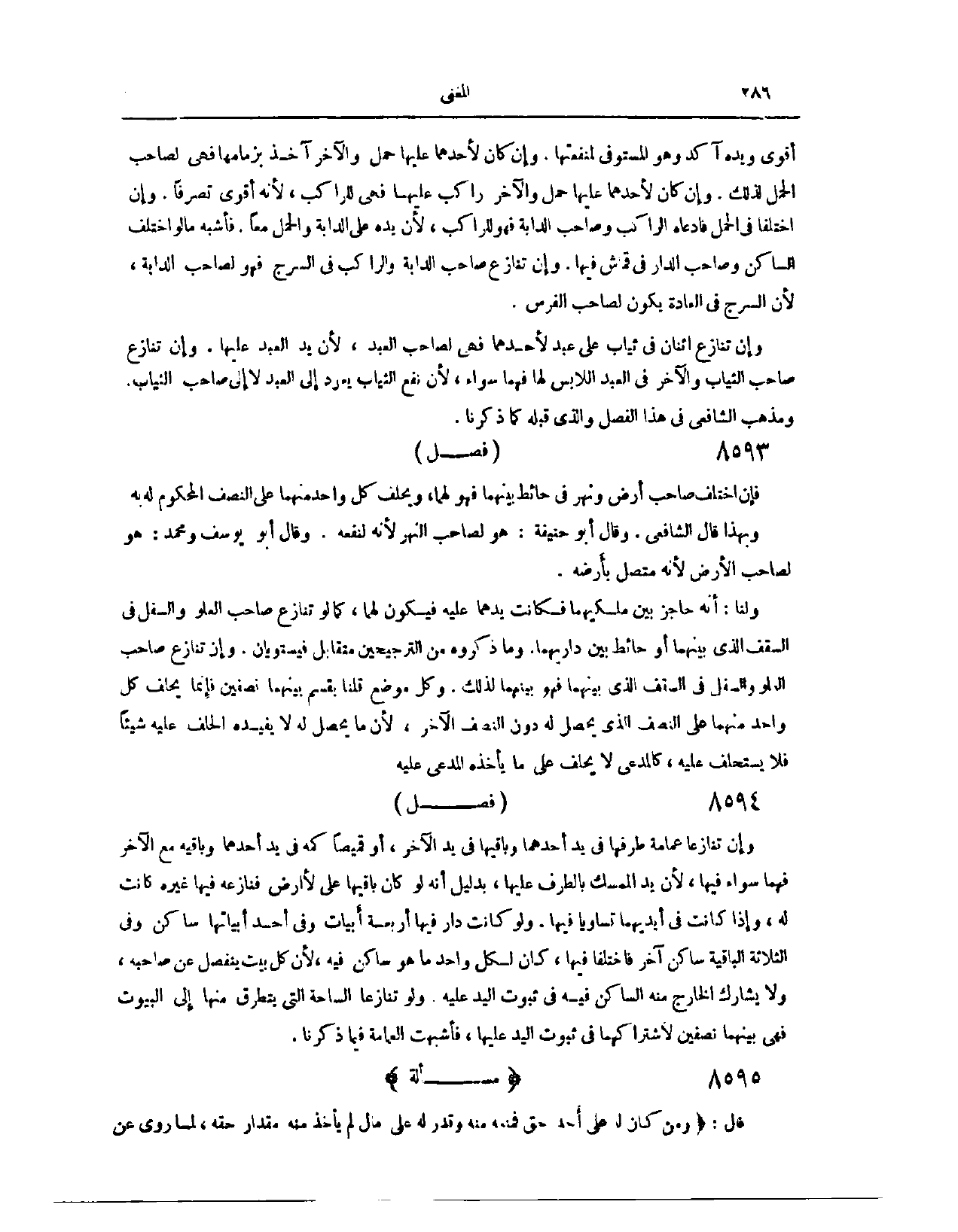 (٨٥٦٢) فَصْلٌ: وَإِنْ اخْتَلَفَ صَاحِبُ أَرْضٍ وَنَهْرٍ فِي حَائِطٍ بَيْنَهُمَا، فَهُوَ لَهُمَا وَيَحْلِفُ كُلُّ وَاحِدٍ مِنْهُمَا عَلَى النِّصْفِ الْمَحْكُومِ لَهُ بِهِ. وَبِهَذَا قَالَ الشَّافِعِيُّ، وَقَالَ أَبُو حَنِيفَةَ: هُوَ لِصَاحِبِ النَّهْرِ؛ لِأَنَّهُ لِنَفْعِهِ. وَقَالَ أَبُو يُوسُفَ، وَمُحَمَّدٌ هُوَ لِصَاحِبِ الْأَرْضِ؛ لِأَنَّهُ مُتَّصِلٌ بِأَرْضِهِ. وَلَنَا، أَنَّهُ حَاجِزٌ بَيْنَ مِلْكَيْهِمَا، فَكَانَتْ يَدُهُمَا عَلَيْهِ، فَيَكُونُ لَهُمَا، كَمَا لَوْ تَنَازَعَ صَاحِبُ الْعُلْوِ وَالسُّفْلِ فِي السَّقْفِ الَّذِي بَيْنَهُمَا، أَوْ حَائِطٍ بَيْنَ دَارَيْهِمَا. وَمَا ذَكَرُوهُ مِنْ التَّرْجِيحَيْنِ مُتَقَابِلٌ، فَيَسْتَوِيَانِ. وَإِنْ تَنَازَعَ صَاحِبُ الْعُلْوِ وَالسُّفْلِ فِي السَّقْفِ الَّذِي بَيْنَهُمَا، فَهُوَ بَيْنَهُمَا، لِذَلِكَ. وَكُلُّ مَوْضِعٍ قُلْنَا يُقْسَمُ بَيْنَهُمَا نِصْفَيْنِ. فَإِنَّمَا يَحْلِفُ كُلُّ وَاحِدٍ مِنْهُمَا عَلَى النِّصْفِ الَّذِي يَحْصُلُ لَهُ، دُونَ النِّصْفِ الْآخَرِ لِأَنَّ مَا يَحْصُلُ لَهُ لَا يُفِيدُهُ الْحَلِفُ عَلَيْهِ شَيْئًا، فَلَا يَسْتَحْلِفُ عَلَيْهِ، كَالْمُدَّعِي لَا يَحْلِفُ عَلَى مَا يَأْخُذُهُ الْمُدَّعَى عَلَيْهِ.