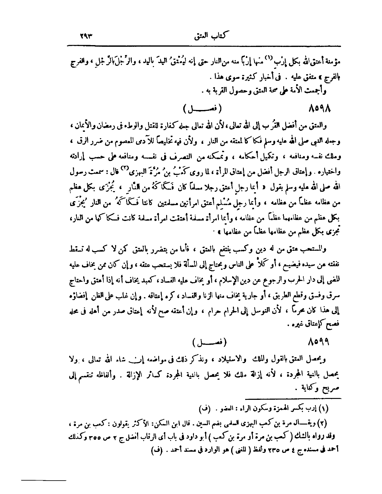 (٨٥٦٧) فَصْلٌ: وَالْعِتْقُ مِنْ أَفْضَلِ الْقُرَبِ إلَى اللَّهِ تَعَالَى؛ لِأَنَّ اللَّهَ تَعَالَى جَعَلَهُ كَفَّارَةً لِلْقَتْلِ، وَالْوَطْءِ فِي رَمَضَانَ وَالْأَيْمَانِ، وَجَعَلَهُ النَّبِيُّ - صَلَّى اللَّهُ عَلَيْهِ وَسَلَّمَ - فِكَاكًا لِمُعْتِقِهِ مِنْ النَّارِ، وَلِأَنَّ فِيهِ تَخْلِيصًا لِلْآدَمِيِّ الْمَعْصُومِ مِنْ ضَرَرِ الرِّقِّ وَمِلْكَ نَفْسِهِ وَمَنَافِعِهِ، وَتَكْمِيلَ أَحْكَامِهِ، وَتَمَكُّنَهُ مِنْ التَّصَرُّفِ فِي نَفْسِهِ وَمَنَافِعِهِ، عَلَى حَسْبِ إرَادَتِهِ وَاخْتِيَارِهِ. وَإِعْتَاقُ الرَّجُلِ أَفْضَلُ مِنْ إعْتَاقِ الْمَرْأَةِ؛ لِمَا رَوَى كَعْبُ بْنُ مُرَّةَ الْبَهْزِيُّ قَالَ: سَمِعْت رَسُولَ اللَّهِ - صَلَّى اللَّهُ عَلَيْهِ وَسَلَّمَ - يَقُولُ «أَيُّمَا رَجُلٍ أَعْتَقَ رَجُلًا مُسْلِمًا، كَانَ فِكَاكَهُ مِنْ النَّارِ، يُجْزَى بِكُلِّ عَظْمٍ مِنْ عِظَامِهِ عَظْمًا مِنْ عِظَامِهِ، وَأَيُّمَا رَجُلٍ مُسْلِمٍ أَعْتَقَ امْرَأَتَيْنِ مُسْلِمَتَيْنِ، كَانَتَا فِكَاكَهُ مِنْ النَّارِ، يُجْزَى بِكُلِّ عَظْمٍ مِنْ عِظَامِهِمَا، عَظْمًا مِنْ عِظَامِهِ، وَأَيُّمَا، امْرَأَةٍ مُسْلِمَةٍ أَعْتَقَتْ امْرَأَةً مُسْلِمَةً، كَانَتْ فِكَاكَهَا مِنْ النَّارِ، تُجْزَى بِكُلِّ عَظْمٍ مِنْ عِظَامِهَا عَظْمًا مِنْ عِظَامِهَا» .