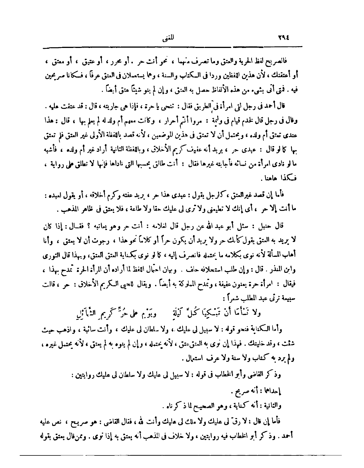 وَأَمَّا الْكِنَايَةُ، فَنَحْوُ قَوْلِهِ: لَا سَبِيلَ لِي عَلَيْك، وَلَا سُلْطَانَ لِي عَلَيْك، وَأَنْتَ سَائِبَةٌ، وَاذْهَبْ حَيْثُ شِئْت، وَقَدْ خَلَّيْتُك. فَهَذَا إنْ نَوَى بِهِ الْعِتْقَ، عَتَقَ؛ لِأَنَّهُ يَحْتَمِلُهُ، وَإِنْ لَمْ يَنْوِهِ بِهِ لَمْ يَعْتِقْ؛ لِأَنَّهُ يَحْتَمِلُ غَيْرَهُ. وَلَمْ يَرِدْ بِهِ كِتَابٌ، وَلَا سُنَّةٌ، وَلَا عُرْفُ اسْتِعْمَالٍ.
