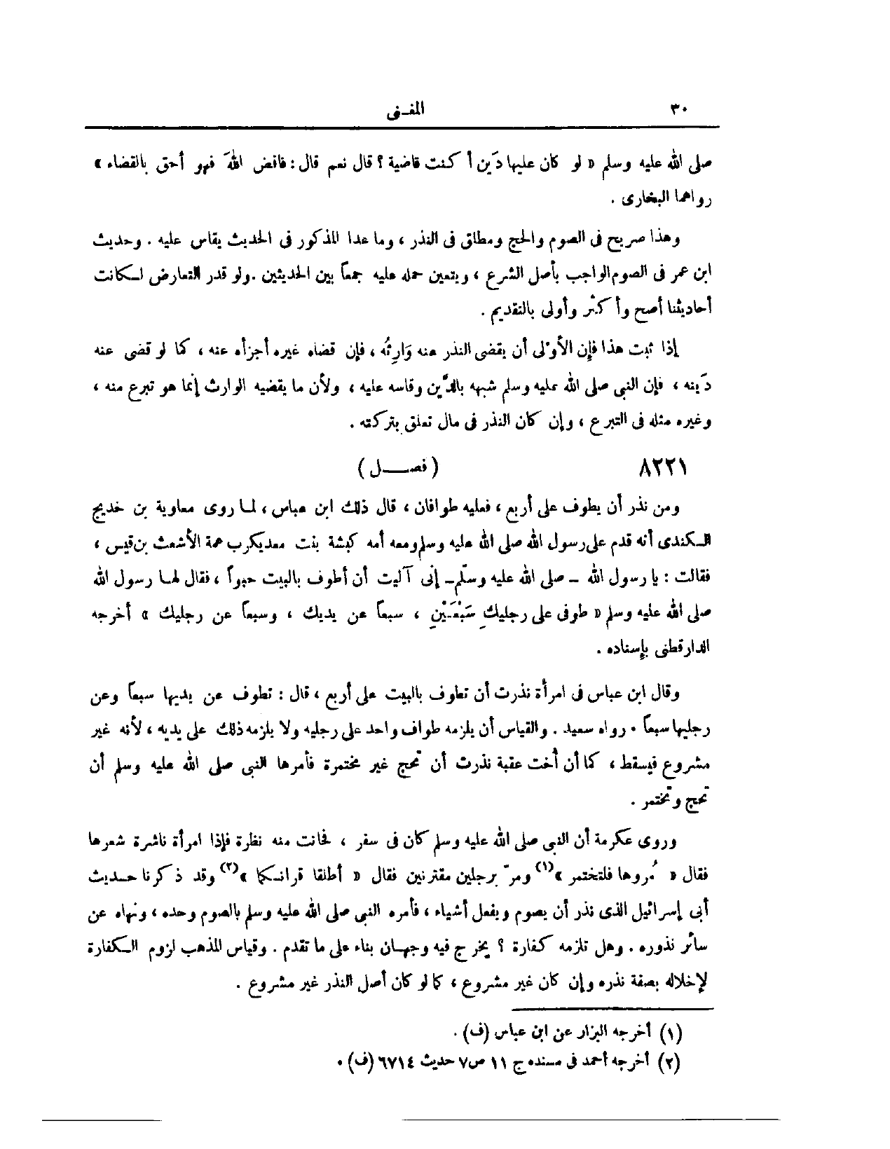 (٨٢١٢) فَصْلٌ: وَمَنْ نَذَرَ أَنْ يَطُوفَ عَلَى أَرْبَعٍ، فَعَلَيْهِ طَوَافَانِ. قَالَ ذَلِكَ ابْنُ عَبَّاسٍ؛ لِمَا رَوَى «مُعَاوِيَةُ بْنُ خَدِيجٍ الْكِنْدِيُّ، أَنَّهُ قَدِمَ عَلَى رَسُولِ اللَّهِ - صَلَّى اللَّهُ عَلَيْهِ وَسَلَّمَ - وَمَعَهُ أُمُّهُ كَبْشَةُ بِنْتُ مَعْدِيكَرِبَ عَمَّةُ الْأَشْعَثِ بْنِ قَيْسٍ فَقَالَتْ: يَا رَسُولَ اللَّهِ إنِّي آلَيْتُ أَنْ أَطُوفَ بِالْبَيْتِ حَبْوًا. فَقَالَ لَهَا رَسُولُ اللَّهِ - صَلَّى اللَّهُ عَلَيْهِ وَسَلَّمَ -: طُوفِي عَلَى رِجْلَيْك سَبْعَيْنِ؛ سَبْعًا عَنْ يَدَيْك، وَسَبْعًا عَنْ رِجْلَيْك» . أَخْرَجَهُ الدَّارَقُطْنِيّ، بِإِسْنَادِهِ وَقَالَ ابْنِ عَبَّاسٍ، فِي امْرَأَةٍ نَذَرَتْ أَنْ تَطُوفَ بِالْبَيْتِ عَلَى أَرْبَعٍ، قَالَ: تَطُوفُ عَنْ يَدَيْهَا سَبْعًا، وَعَنْ رِجْلَيْهَا سَبْعًا. رَوَاهُ سَعِيدٌ.