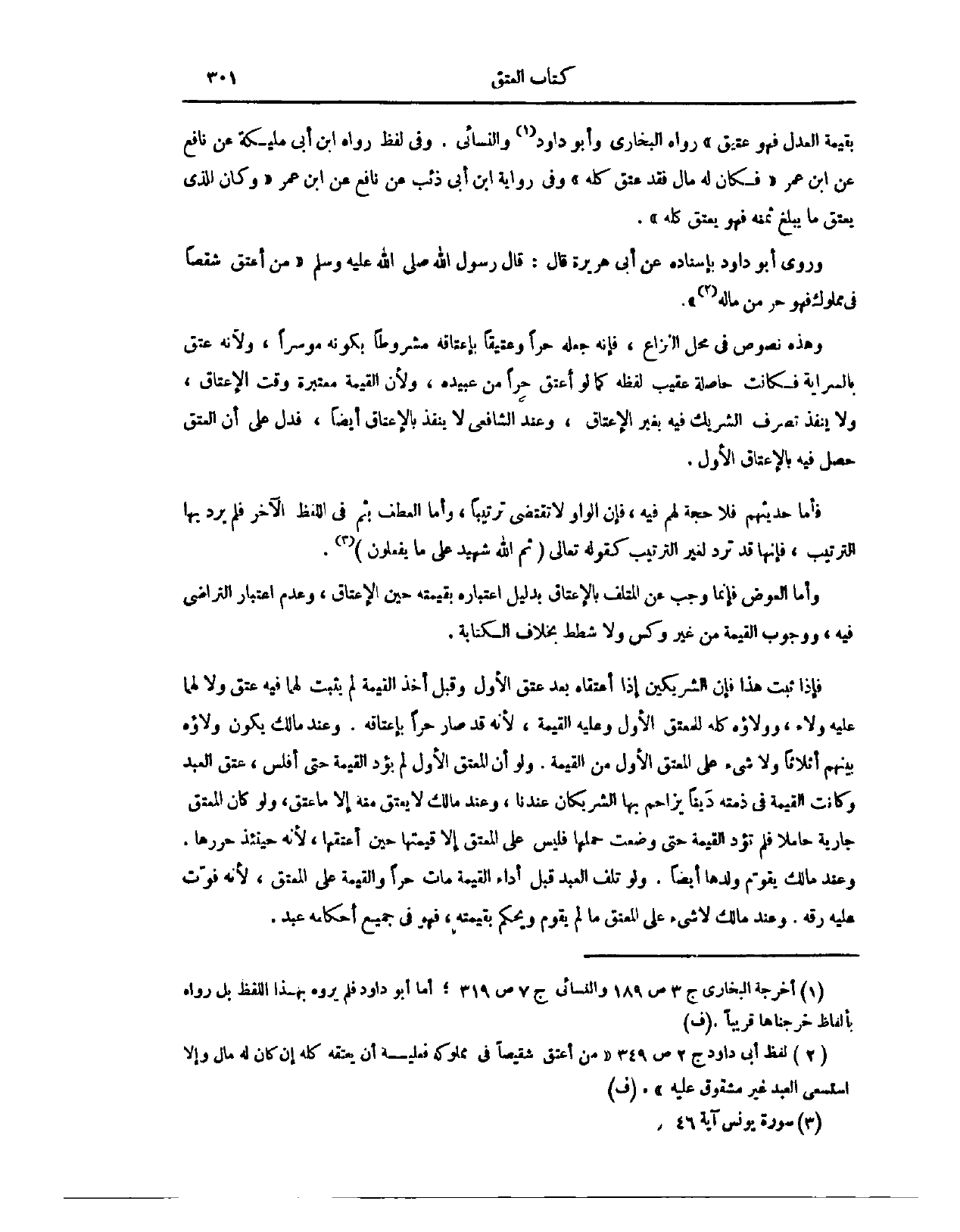 بِقِيمَةِ الْعَدْلِ، فَهُوَ عَتِيقٌ» . رَوَاهُ الْبُخَارِيُّ، وَأَبُو دَاوُد، وَالنَّسَائِيُّ، وَفِي لَفْظٍ رَوَاهُ ابْنُ أَبِي مُلَيْكَةَ، عَنْ نَافِعٍ، عَنْ ابْنِ عُمَرَ: " فَكَانَ لَهُ مَالٌ، فَقَدْ عَتَقَ كُلُّهُ ". وَفِي رِوَايَةِ ابْنِ أَبِي ذِئْبٍ، عَنْ نَافِعٍ، عَنْ ابْنِ عُمَرَ: " وَكَانَ لِلَّذِي يُعْتِقُ مَا يَبْلُغُ ثَمَنَهُ، فَهُوَ يَعْتِقُ كُلُّهُ ". وَرَوَى أَبُو دَاوُد، بِإِسْنَادِهِ، عَنْ أَبِي هُرَيْرَةَ، قَالَ: قَالَ رَسُولُ اللَّهِ - صَلَّى اللَّهُ عَلَيْهِ وَسَلَّمَ -: «مَنْ أَعْتَقَ شِقْصًا فِي مَمْلُوكٍ، فَهُوَ حُرٌّ مِنْ مَالِهِ» . وَهَذِهِ نُصُوصٌ فِي مَحَلِّ النِّزَاعِ، فَإِنَّهُ جَعَلَهُ حُرًّا وَعَتِيقًا بِإِعْتَاقِهِ، مَشْرُوطًا بِكَوْنِهِ مُوسِرًا. وَلِأَنَّهُ عِتْقٌ بِالسِّرَايَةِ، فَكَانَتْ حَاصِلَةً عَقِيبَ لَفْظِهِ، كَمَا لَوْ أَعْتَقَ جُزْءًا مِنْ عَبِيدِهِ، وَلِأَنَّ الْقِيمَةَ مُعْتَبَرَةٌ وَقْتَ الْإِعْتَاقِ، وَلَا يَنْفُذُ تَصَرُّفُ الشَّرِيكِ فِيهِ بِغَيْرِ الْإِعْتَاقِ.