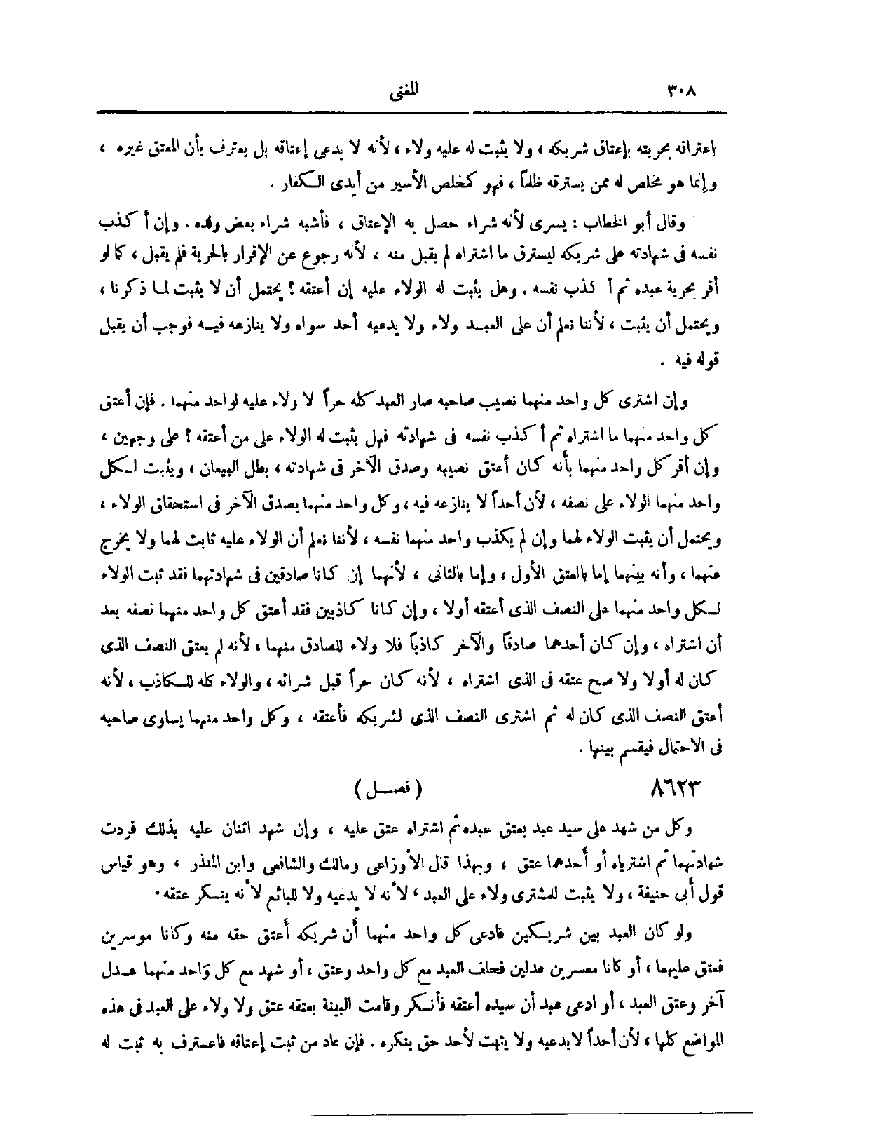 (٨٥٩٢) فَصْلٌ وَكُلُّ مَنْ شَهِدَ عَلَى سَيِّدِ عَبْدٍ بِعِتْقِ عَبْدِهِ ثُمَّ اشْتَرَاهُ عَتَقَ عَلَيْهِ، وَإِنْ شَهِدَ اثْنَانِ عَلَيْهِ بِذَلِكَ فَرُدَّتْ شَهَادَتُهُمَا ثُمَّ اشْتَرَيَاهُ أَوْ أَحَدُهُمَا عَتَقَ، وَبِهَذَا قَالَ الْأَوْزَاعِيُّ وَمَالِكٌ وَالشَّافِعِيُّ وَابْنُ الْمُنْذِرِ، وَهُوَ قِيَاسُ قَوْلِ أَبِي حَنِيفَةَ، وَلَا يَثْبُتُ لِلْمُشْتَرِي وَلَاءٌ عَلَى الْعَبْدِ لِأَنَّهُ لَا يَدَّعِيه وَلَا لِلْبَائِعِ لِأَنَّهُ يُنْكِرُ عِتْقَهُ، وَلَوْ كَانَ الْعَبْدُ بَيْنَ شَرِيكَيْنِ فَادَّعَى كُلُّ وَاحِدٍ مِنْهُمَا أَنَّ شَرِيكَهُ أَعْتَقَ حَقَّهُ مِنْهُ وَكَانَا مُوسِرَيْنِ فَعَتَقَ عَلَيْهِمَا أَوْ كَانَا مُعْسِرَيْنِ عَدْلَيْنِ فَحَلَفَ الْعَبْدُ مِنْ كُلِّ وَاحِدٍ وَعَتَقَ، أَوْ شَهِدَ مَعَ كُلِّ وَاحِدٍ مِنْهُمَا عَدْلٌ آخَرُ وَعَتَقَ الْعَبْدُ أَوْ ادَّعَى عَبْدٌ أَنَّ سَيِّدَهُ أَعْتَقَهُ فَأَنْكَرَ وَقَامَتْ الْبَيِّنَةُ بِعِتْقِهِ عَتَقَ، وَلَا وَلَاءَ عَلَى الْعَبْدِ فِي هَذِهِ الْمَوَاضِعِ كُلِّهَا لِأَنَّ أَحَدًا لَا يَدَّعِيه، وَلَا يَثْبُتُ لِأَحَدٍ حَقٌّ يُنْكِرُهُ، فَإِنْ عَادَ مَنْ ثَبَتَ إعْتَاقُهُ فَاعْتَرَفَ بِهِ ثَبَتَ لَهُ