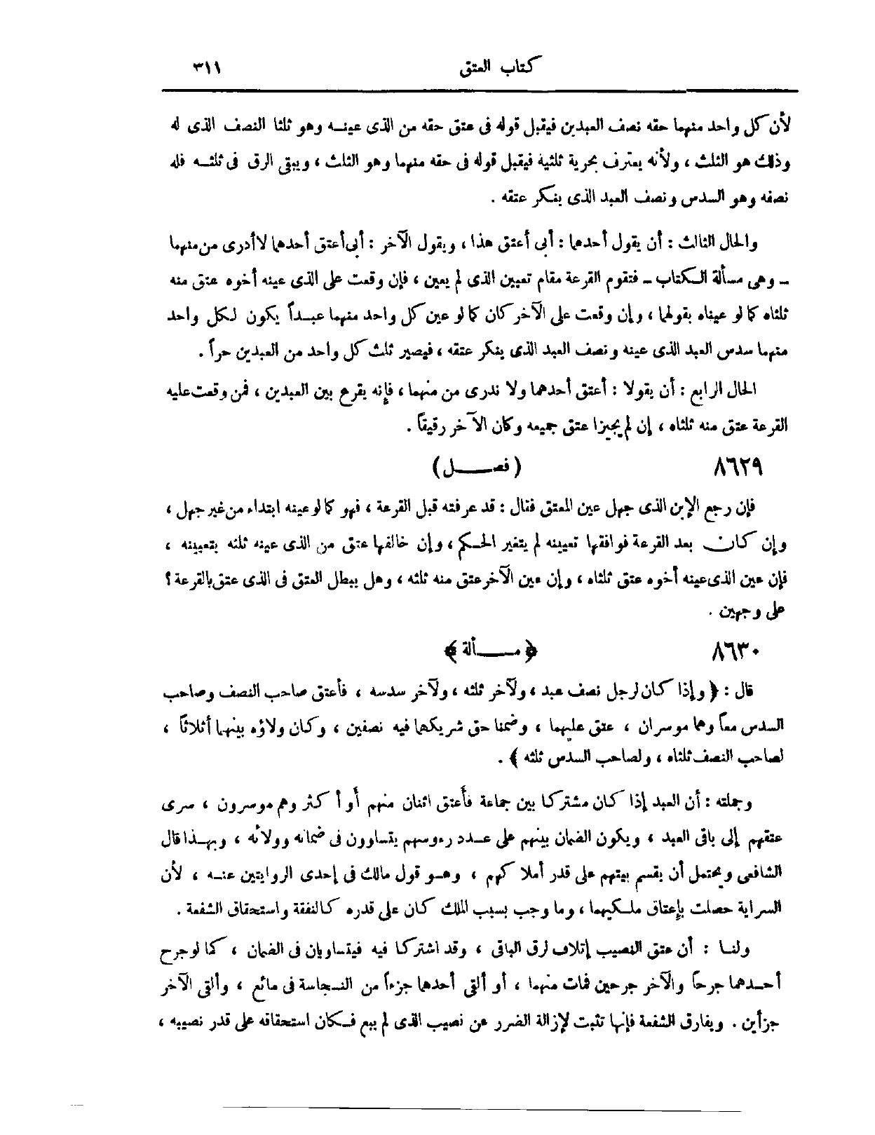 وَالْحَالُ الثَّالِثُ أَنْ يَقُولَ أَحَدُهُمَا أَبِي أَعْتَقَ هَذَا، يَقُولُ الْآخَرُ أَبِي أَعْتَقَ أَحَدَهُمَا لَا أَدْرِي مَنْ مِنْهُمَا وَهِيَ مَسْأَلَةُ الْكِتَابِ فَتَقُمْ الْقُرْعَةُ مَقَامَ تَعْيِينِ الَّذِي لَمْ يُعَيِّنْ، فَإِنْ وَقَعَتْ عَلَى الَّذِي عَيَّنَهُ أَخُوهُ عَتَقَ مِنْهُ ثُلُثَاهُ كَمَا لَوْ عَيَّنَاهُ بِقَوْلِهِمَا، وَإِنْ وَقَعَتْ عَلَى الْآخَرِ كَانَ كَمَا لَوْ عَيَّنَ كُلُّ وَاحِدٍ مِنْهُمَا عَبْدًا يَكُونُ لِكُلِّ وَاحِدٍ مِنْهُمَا سُدُسُ الْعَبْدِ الَّذِي عَيَّنَهُ وَنِصْفُ الْعَبْدِ الَّذِي يُنْكِرُ عِتْقَهُ فَيَصِيرُ ثُلُثُ كُلِّ وَاحِدٍ مِنْ الْعَبْدَيْنِ حُرًّا، وَالْحَالُ الرَّابِعُ أَنْ يَقُولَا أَعْتَقَ أَحَدَهُمَا وَلَا نَدْرِي مَنْ مِنْهُمَا فَإِنَّهُ يَقْرَعُ بَيْنَ الْعَبْدَيْنِ فَمَنْ وَقَعَتْ عَلَيْهِ الْقُرْعَةُ عَتَقَ مِنْهُ ثُلُثَاهُ إنْ لَمْ يُجِيزَا عِتْقَ جَمِيعِهِ وَكَانَ الْآخَرُ رَقِيقًا. (٨٥٩٨)