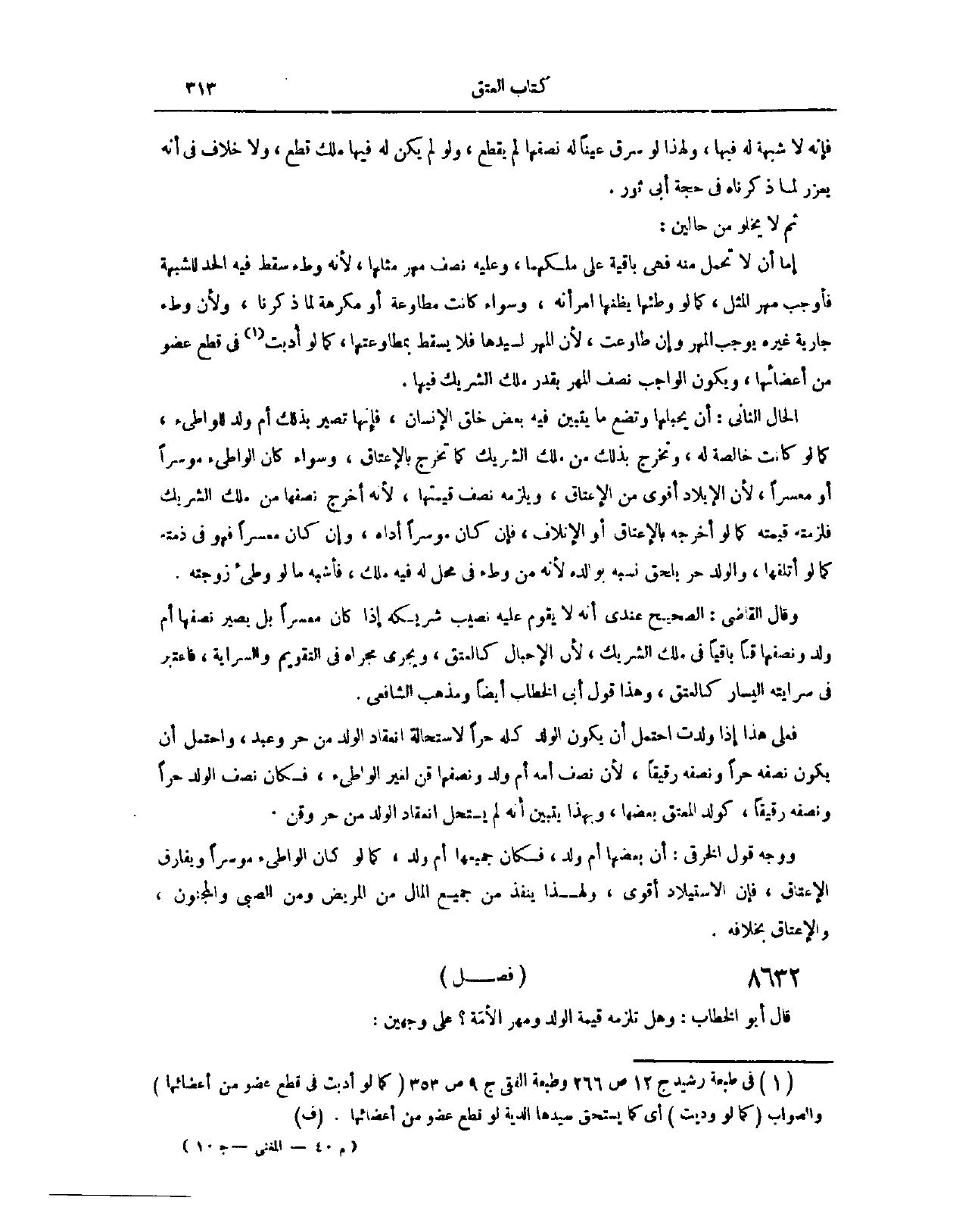 (٨٦٠١) فَصْلٌ: قَالَ أَبُو الْخَطَّابِ: وَهَلْ تَلْزَمُهُ قِيمَةُ الْوَلَدِ وَمَهْرُ الْأَمَةِ؟ عَلَى وَجْهَيْنِ؛
