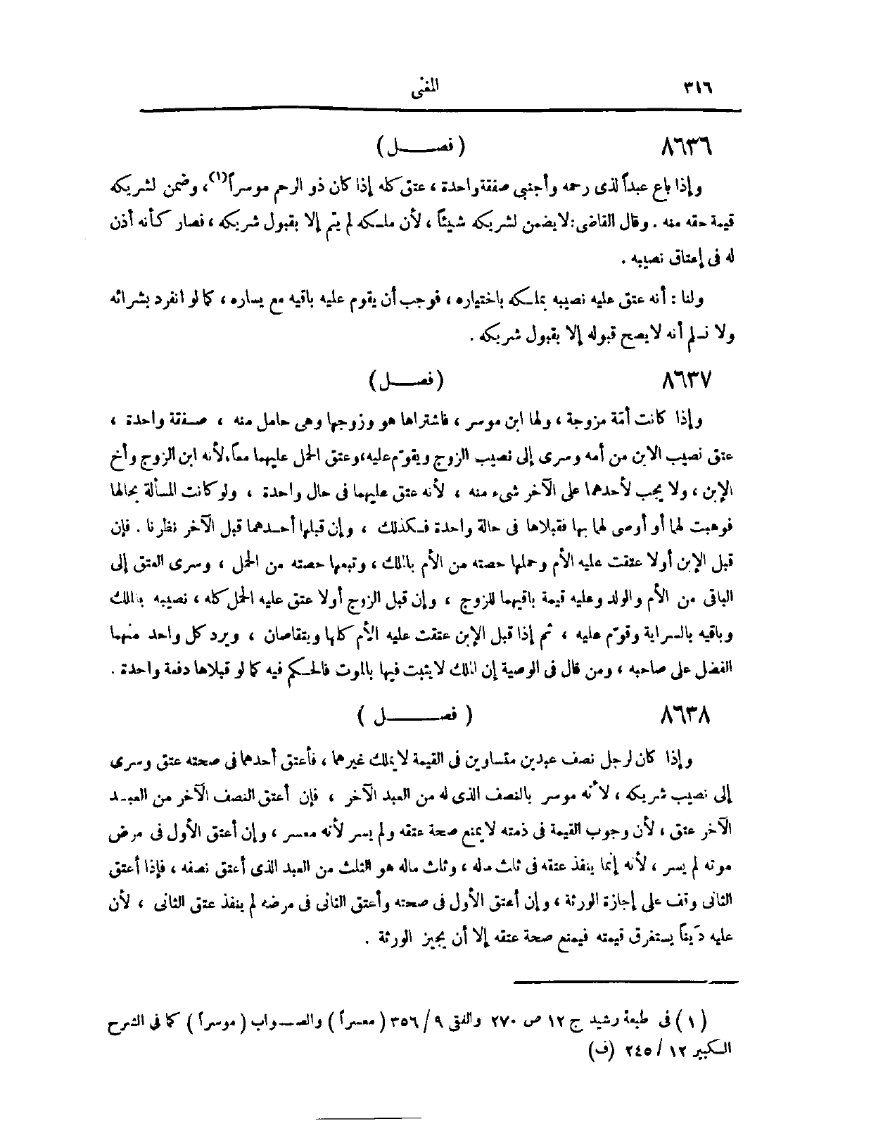 (٨٦٠٧) فَصْلٌ: وَإِذَا كَانَ لِرَجُلٍ نِصْفُ عَبْدَيْنِ مُتَسَاوِيَيْنِ فِي الْقِيمَةِ، لَا يَمْلِكُ غَيْرَهُمَا، فَأَعْتَقَ أَحَدَهُمَا فِي صِحَّتِهِ، عَتَقَ، وَسَرَى إلَى نَصِيبِ شَرِيكِهِ؛ لِأَنَّهُ مُوسِرٌ بِالنِّصْفِ الَّذِي لَهُ مِنْ الْعَبْدِ الْآخَرِ، فَإِنْ أَعْتَقَ النِّصْفَ الْآخَرَ، مِنْ الْعَبْدِ الْآخِرِ، عَتَقَ؛ لِأَنَّ وُجُوبَ الْقِيمَةِ فِي ذِمَّتِهِ لَا يَمْنَعُ صِحَّةَ عِتْقِهِ، وَلَمْ يَسْرِ؛ لِأَنَّهُ مُعْسِرٌ، وَإِنْ أَعْتَقَ الْأَوَّلَ فِي مَرَضِ مَوْتِهِ، لَمْ يَسْرِ؛ لِأَنَّهُ إنَّمَا يَنْفُذُ عِتْقُهُ فِي ثُلُثِ مَالِهِ، وَثُلُثُ مَالِهِ هُوَ الثُّلُثُ مِنْ الْعَبْدِ الَّذِي أَعْتَقَ نِصْفَهُ، وَإِذَا أَعْتَقَ الثَّانِيَ، وَقَفَ عَلَى إجَازَةِ الْوَرَثَةِ، وَإِنْ أَعْتَقَ الْأَوَّلَ فِي صِحَّتِهِ، وَأَعْتَقَ الثَّانِيَ، فِي مَرَضِهِ، لَمْ يَنْفُذْ عِتْقُ الثَّانِي؛ لِأَنَّ عَلَيْهِ دَيْنًا يَسْتَغْرِقُ قِيمَتَهُ، فَيَمْنَعُ صِحَّةَ عِتْقِهِ، إلَّا أَنْ يُجِيزَ الْوَرَثَةُ.