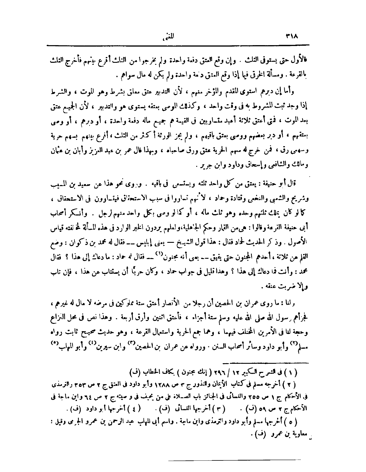 وَذُكِرَ الْحَدِيثُ لِحَمَّادٍ، فَقَالَ: هَذَا قَوْلُ الشَّيْخِ - يَعْنِي إبْلِيسَ - فَقَالَ لَهُ مُحَمَّدُ بْنُ ذَكْوَانَ: وُضِعَ الْقَلَمُ عَنْ ثَلَاثَةٍ؛ أَحَدُهُمْ الْمَجْنُونُ حَتَّى يُفِيقَ - يَعْنِي إنَّكَ مَجْنُونٌ - فَقَالَ لَهُ حَمَّادٌ: مَا دَعَاكَ إلَى هَذَا؟ فَقَالَ لَهُ مُحَمَّدٌ: وَأَنْتَ، فَمَا دَعَاكَ إلَى هَذَا؟ وَهَذَا قَلِيلٌ فِي جَوَابِ حَمَّادٍ، وَكَانَ حَرِيًّا أَنْ يُسْتَتَابَ عَنْ هَذَا، فَإِنْ تَابَ وَإِلَّا ضُرِبَتْ عُنُقُهُ. وَلَنَا مَا رَوَى عِمْرَانُ بْنُ الْحُصَيْنِ، «أَنَّ رَجُلًا مِنْ الْأَنْصَارِ أَعْتَقَ سِتَّةَ مَمْلُوكِينَ فِي مَرَضِهِ، لَا مَالَ لَهُ غَيْرُهُمْ، فَجَزَّأَهُمْ رَسُولُ اللَّهِ - صَلَّى اللَّهُ عَلَيْهِ وَسَلَّمَ - سِتَّةَ أَجْزَاءٍ، فَأَعْتَقَ اثْنَيْنِ، وَأَرَقَّ أَرْبَعَةً» . وَهَذَا نَصٌّ فِي مَحِلِّ النِّزَاعِ، وَحُجَّةٌ لَنَا فِي الْأَمْرَيْنِ الْمُخْتَلَفِ فِيهِمَا، وَهُمَا جَمْعُ الْحُرِّيَّةِ وَاسْتِعْمَالُ الْقُرْعَةِ، وَهُوَ حَدِيثٌ صَحِيحٌ ثَابِتٌ، رَوَاهُ مُسْلِمٌ، وَأَبُو دَاوُد، وَسَائِرُ أَصْحَابِ السُّنَنِ. وَرَوَاهُ عَنْ عِمْرَانَ بْنِ الْحُصَيْنِ الْحَسَنُ، وَابْنُ سِيرِينَ، وَأَبُو الْمُهَلَّبِ،