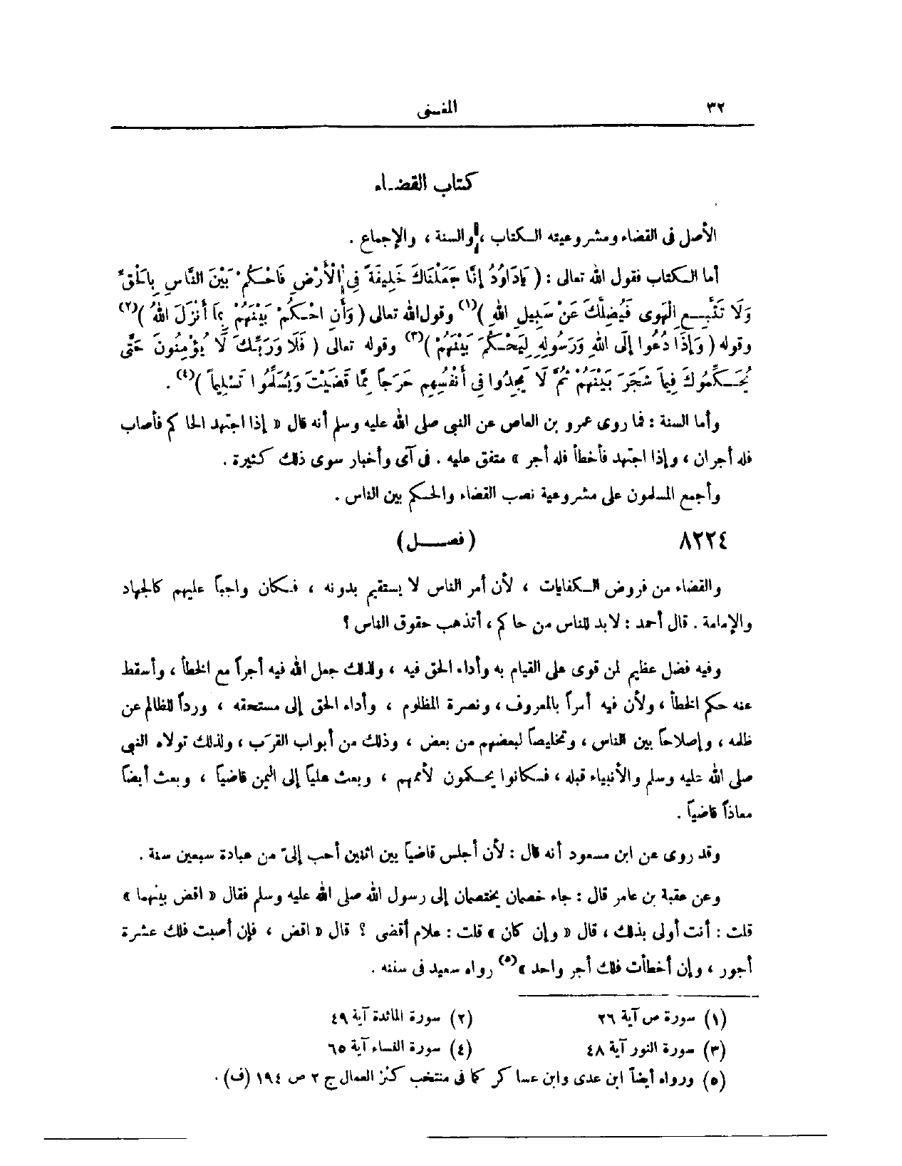 ِ الْأَصْلُ فِي الْقَضَاءِ وَمَشْرُوعِيَّتِهِ الْكِتَابُ وَالسُّنَّةُ وَالْإِجْمَاعُ. أَمَّا الْكِتَابُ فَقَوْلُ اللَّهِ تَعَالَى: {يَا دَاوُدُ إِنَّا جَعَلْنَاكَ خَلِيفَةً فِي الأَرْضِ فَاحْكُمْ بَيْنَ النَّاسِ بِالْحَقِّ وَلا تَتَّبِعِ الْهَوَى فَيُضِلَّكَ عَنْ سَبِيلِ اللَّهِ} [ص: ٢٦] . وَقَوْلُ اللَّهِ تَعَالَى: {وَأَنِ احْكُمْ بَيْنَهُمْ بِمَا أَنْزَلَ اللَّهُ} [المائدة: ٤٩] .