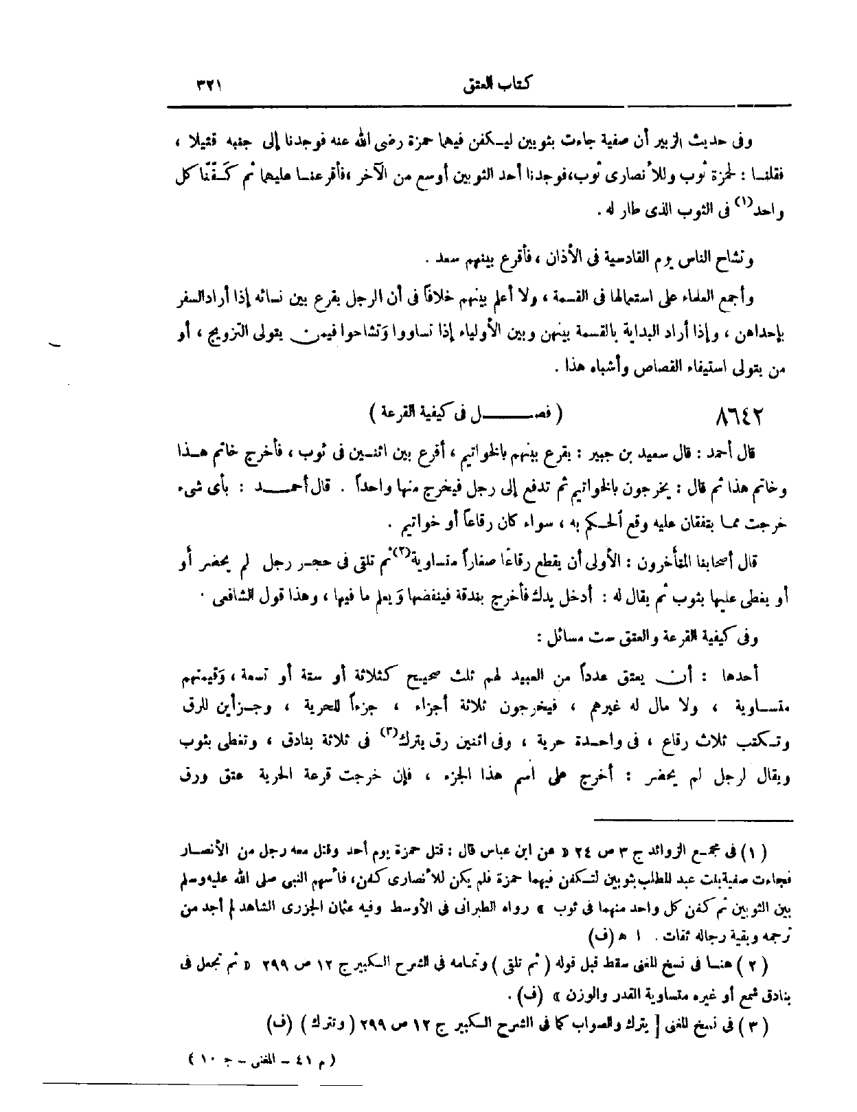 وَفِي حَدِيثِ الزُّبَيْرِ، أَنَّ صَفِيَّةَ جَاءَتْ بِثَوْبَيْنِ؛ لِيُكَفَّنَ فِيهَا حَمْزَةُ - رَضِيَ اللَّهُ عَنْهُ - فَوَجَدْنَا إلَى جَنْبِهِ قَتِيلًا، فَقُلْنَا: لِحَمْزَةَ ثَوْبٌ، وَلِلْأَنْصَارِيِّ ثَوْبٌ. فَوَجَدْنَا أَحَدَ الثَّوْبَيْنِ أَوْسَعَ مِنْ الْآخَرَ، فَأَقْرَعْنَا عَلَيْهِمَا، ثُمَّ كَفَّنَّا كُلَّ وَاحِدٍ فِي الثَّوْبِ الَّذِي صَارَ لَهُ، وَتَشَاحَّ النَّاسُ يَوْمَ الْقَادِسِيَّةِ فِي الْأَذَانِ، فَأَقْرَعِ بَيْنَهُمْ سَعْدٌ وَأَجْمَعَ الْعُلَمَاءُ عَلَى اسْتِعْمَالِهَا فِي الْقِسْمَةِ، وَلَا أَعْلَمُ بَيْنَهُمْ خِلَافًا فِي أَنَّ الرَّجُلَ يَقْرَعُ بَيْنَ نِسَائِهِ إذَا أَرَادَ السَّفَرَ بِإِحْدَاهُنَّ، وَإِذَا أَرَادَ الْبِدَايَةَ بِالْقِسْمَةِ بَيْنَهُنَّ، وَبَيْنَ الْأَوْلِيَاءِ إذَا تَسَاوَوْا وَتَشَاحُّوا فِي مَنْ يَتَوَلَّى التَّزْوِيجَ أَوْ مَنْ يَتَوَلَّى اسْتِيفَاءَ الْقِصَاصِ، وَأَشْبَاهَ هَذَا.