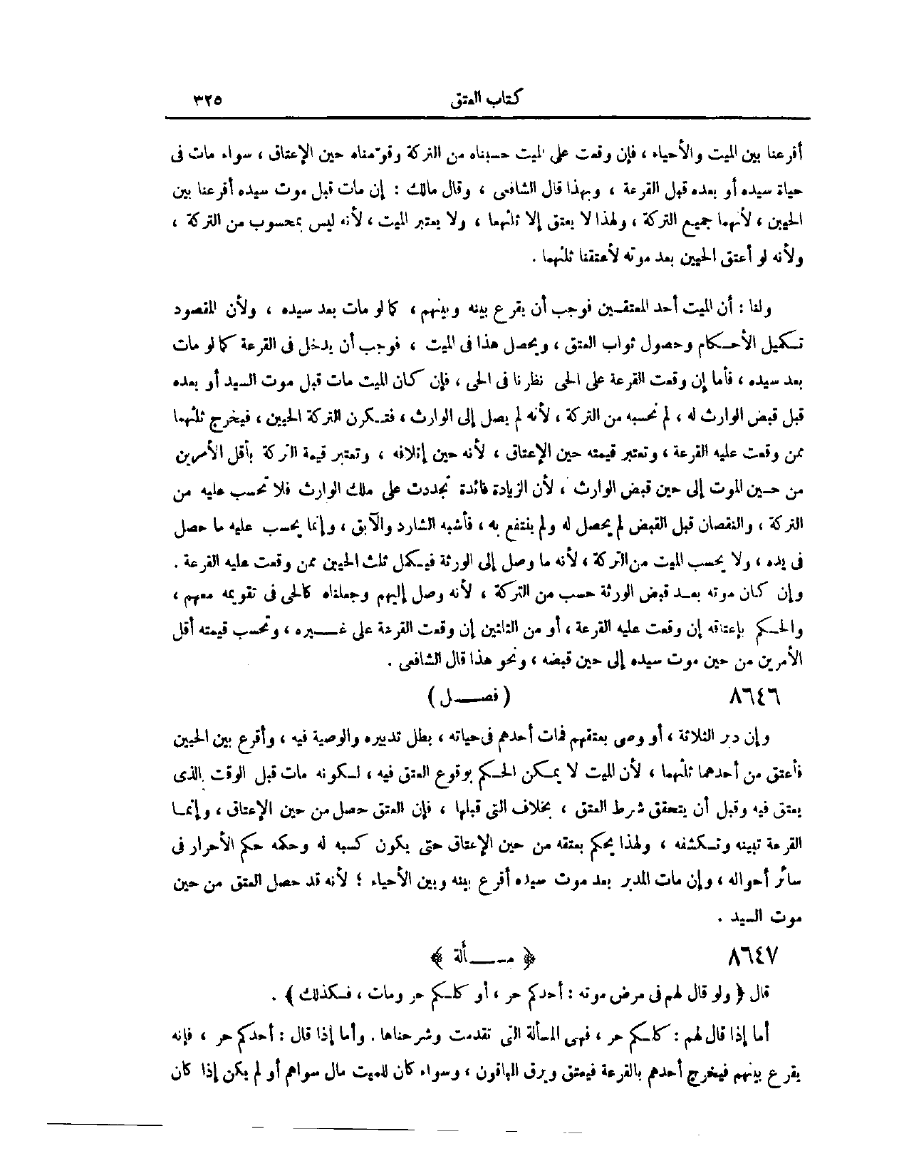 (٨٦٢١) فَصْلٌ: وَإِنْ دَبَّرَ الثَّلَاثَةَ، أَوْ وَصَّى بِعِتْقِهِمْ، فَمَاتَ أَحَدُهُمْ فِي حَيَاتِهِ، بَطَلَ تَدْبِيرُهُ، وَالْوَصِيَّةُ فِيهِ، وَأَقْرَعَ بَيْنَ الْحَيَّيْنِ فَأُعْتِقَ مِنْ أَحَدِهِمَا ثُلُثُهُمَا؛ لِأَنَّ الْمَيِّتَ لَا يُمْكِنُ الْحُكْمُ بِوُقُوعِ الْعِتْقِ فِيهِ؛ لِكَوْنِهِ مَاتَ قَبْلَ الْوَقْتِ الَّذِي يَعْتِقُ فِيهِ، وَقَبْلَ أَنْ يَتَحَقَّقَ شَرْطُ الْعِتْقِ، بِخِلَافِ الَّتِي قَبْلَهَا؛ فَإِنَّ الْعِتْقَ حَصَلَ مِنْ حِينِ الْإِعْتَاقِ، وَإِنَّمَا الْقُرْعَةُ تُبَيِّنُهُ وَتَكْشِفُهُ، وَلِهَذَا يُحْكَمُ بِعِتْقِهِ مِنْ حِينِ الْإِعْتَاقِ، حَتَّى يَكُونَ كَسْبُهُ لَهُ، وَحُكْمُهُ حُكْمُ الْأَحْرَارِ فِي سَائِرِ أَحْوَالِهِ. وَإِنْ مَاتَ الْمُدَبَّرُ بَعْدَ مَوْتِ سَيِّدِهِ أَقْرَعَ بَيْنَهُ وَبَيْنَ الْأَحْيَاءِ؛ لِأَنَّهُ قَدْ حَصَلَ الْعِتْقُ مِنْ حِينِ مَوْتِ السَّيِّدِ.
