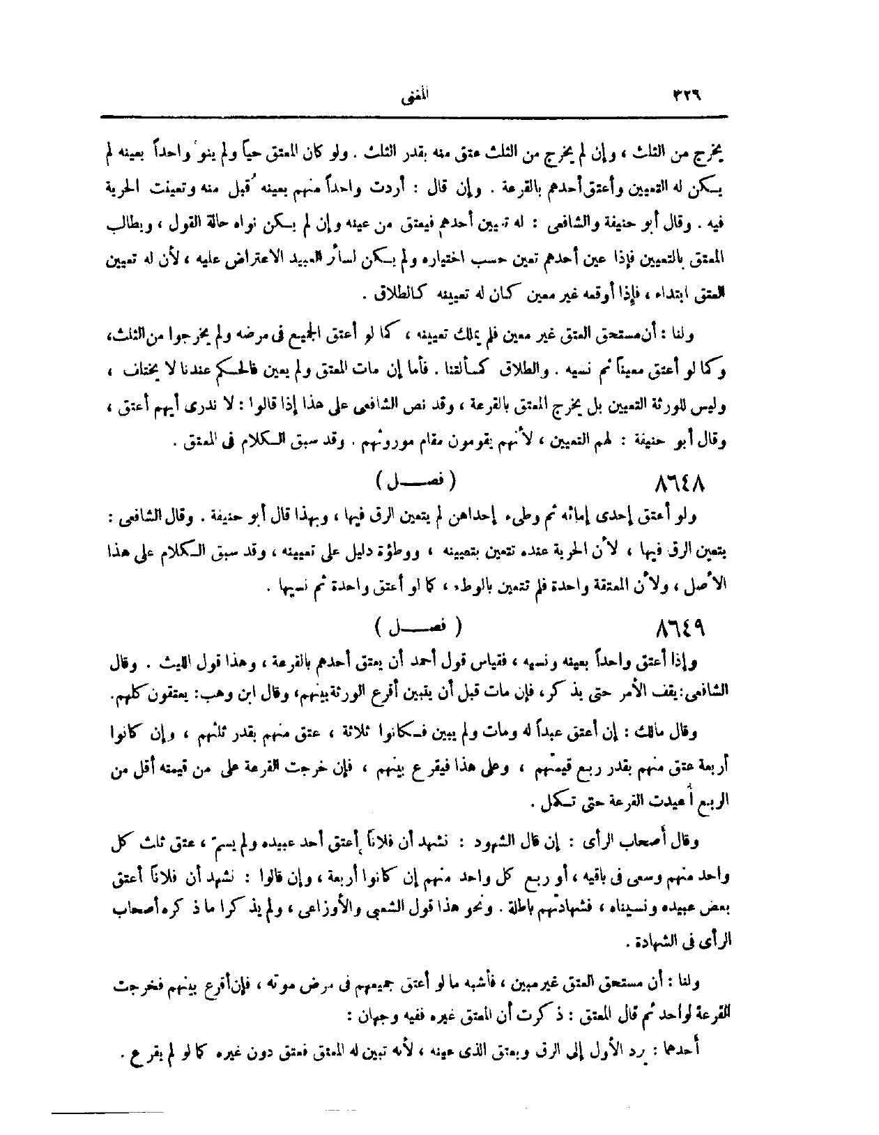 . (٨٦٢٤) فَصْلٌ: وَإِذَا أَعْتَقَ وَاحِدًا بِعَيْنِهِ، وَنَسِيَهُ، فَقِيَاسُ قَوْلِ أَحْمَدَ، أَنْ يَعْتِقَ أَحَدُهُمْ بِالْقُرْعَةِ. وَهَذَا قَوْلُ اللَّيْثِ وَقَالَ الشَّافِعِيُّ: يَقِفُ الْأَمْرُ حَتَّى يَذْكُرَ، فَإِنْ مَاتَ قَبْلَ أَنْ يَتَبَيَّنَ، أَقْرَعَ الْوَرَثَةُ بَيْنَهُمْ، وَقَالَ ابْنُ وَهْبٍ يَعْتِقُونَ كُلُّهُمْ. وَقَالَ مَالِكٌ: إنْ أَعْتَقَ عَبْدًا لَهُ وَمَاتَ، وَلَمْ يُبَيِّنْ فَكَانُوا ثَلَاثَةً، عَتَقَ مِنْهُمْ بِقَدْرِ ثُلُثِهِمْ، وَإِنْ كَانُوا أَرْبَعَةً، عَتَقَ مِنْهُمْ بِقَدْرِ رُبْعِ قِيمَتِهِمْ. وَعَلَى هَذَا فَيُقْرَعُ بَيْنَهُمْ، فَإِنْ خَرَجَتْ الْقُرْعَةُ عَلَى مَنْ قِيمَتُهُ أَقَلُّ مِنْ الرُّبْعِ، أُعِيدَتْ الْقُرْعَةُ حَتَّى تَكْمُلَ. وَقَالَ أَصْحَابُ: الرَّأْيِ: إنْ قَالَ الشُّهُودُ: نَشْهَدُ أَنَّ فُلَانًا أَعْتَقَ أَحَدَ عَبِيدِهِ، وَلَمْ يُسَمِّ. عَتَقَ ثُلُثُ كُلِّ وَاحِدٍ مِنْهُمْ، وَسَعَى فِي بَاقِيه، أَوْ رُبْعُ كُلِّ وَاحِدٍ مِنْهُمْ إنْ كَانُوا أَرْبَعَةً، وَإِنْ قَالُوا: نَشْهَدُ أَنَّ فُلَانًا أَعْتَقَ بَعْضَ عَبِيدِهِ وَنَسِينَاهُ. فَشَهَادَتُهُمْ بَاطِلَةٌ. وَنَحْوُ هَذَا قَوْلُ الشَّعْبِيِّ، وَالْأَوْزَاعِيِّ وَلَمْ يَذْكُرَا مَا ذَكَرَهُ أَصْحَابُ الرَّأْيِ فِي الشَّهَادَةِ.