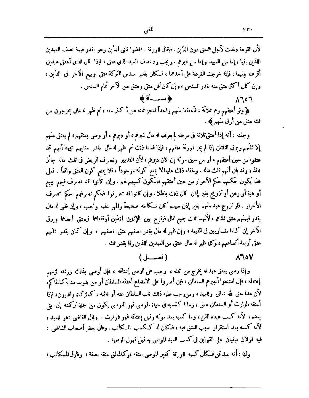 . (٨٦٣١) مَسْأَلَةٌ: قَالَ: (وَلَوْ أَعْتَقَهُمْ، وَهُمْ ثَلَاثَةٌ، فَأَعْتَقْنَا مِنْهُمْ وَاحِدًا لِعَجْزِ ثُلُثِهِ عَنْ أَكْثَرَ مِنْهُ، ثُمَّ ظَهَرَ لَهُ مَالٌ يُخْرِجُونَ مِنْ ثُلُثِهِ، عَتَقَ مَنْ أَرْقِ مِنْهُمْ) وَجُمْلَتُهُ أَنَّهُ إذَا أَعْتَقَ ثَلَاثَةً فِي مَرَضِهِ، لَمْ يُعْرَفْ لَهُ مَالٌ غَيْرُهُمْ، أَوْ دَبَّرَهُمْ، أَوْ وَصَّى بِعِتْقِهِمْ لَمْ يَعْتِقْ مِنْهُمْ إلَّا ثُلُثُهُمْ، وَيَرِقُّ الثُّلُثَانِ، إذَا لَمْ يُجِزْ الْوَرَثَةُ عِتْقَهُمْ، فَإِذَا فَعَلْنَا ذَلِكَ، ثُمَّ ظَهَرَ لَهُ مَالٌ بِقَدْرِ مِثْلَيْهِمْ تَبَيَّنَّا أَنَّهُمْ قَدْ عَتَقُوا مِنْ حِينِ أَعْتَقَهُمْ، أَوْ مِنْ حِينِ مَوْتِهِ إنْ كَانَ دَبَّرَهُمْ؛ لِأَنَّهُ التَّدْبِيرَ وَتَصَرُّفَ الْمَرِيضِ فِي ثُلُثِ مَالِهِ جَائِزٌ نَافِذٌ، وَقَدْ بَانَ أَنَّهُمْ ثُلُثُ مَالِهِ، وَخَفَاءُ ذَلِكَ عَلَيْنَا لَا يَمْنَعُ كَوْنَهُ مَوْجُودًا، فَلَا يَمْنَعُ كَوْنَ الْعِتْقِ وَاقِعًا. فَعَلَى هَذَا، يَكُونُ حُكْمُهُمْ حُكْمَ الْأَحْرَارِ مِنْ حِينَ أَعْتَقَهُمْ، فَيَكُونُ كَسْبُهُمْ. لَهُمْ، وَإِنْ كَانُوا قَدْ تَصَرَّفَ فِيهِمْ بِبَيْعٍ، أَوْ هِبَةٍ، أَوْ رَهْنٍ، أَوْ تَزْوِيجٍ بِغَيْرِ إذْنٍ، كَانَ ذَلِكَ بَاطِلًا.