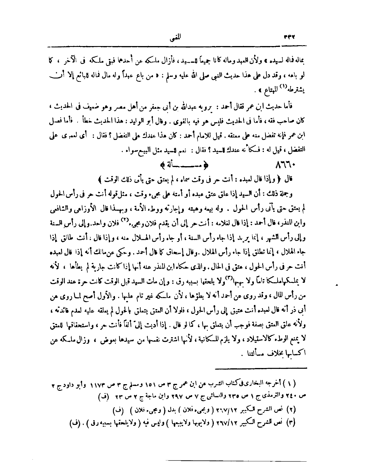 وَقَالَ أَبُو الْوَلِيدِ: هَذَا الْحَدِيثُ خَطَأٌ، فَأَمَّا فِعْلُ ابْنِ عُمَرَ، فَإِنَّهُ تَفَضُّلٌ مِنْهُ عَلَى مُعْتَقِهِ. قِيلَ لِلْإِمَامِ أَحْمَدَ: كَانَ هَذَا عِنْدَك عَلَى التَّفَضُّلِ؟ فَقَالَ: إي لَعَمْرِي عَلَى التَّفَضُّلِ قِيلَ لَهُ: فَكَأَنَّهُ عِنْدَك لِلسَّيِّدِ؟ فَقَالَ: نَعَمْ، لِلسَّيِّدِ، مِثْلُ الْبَيْعِ، سَوَاءٌ.