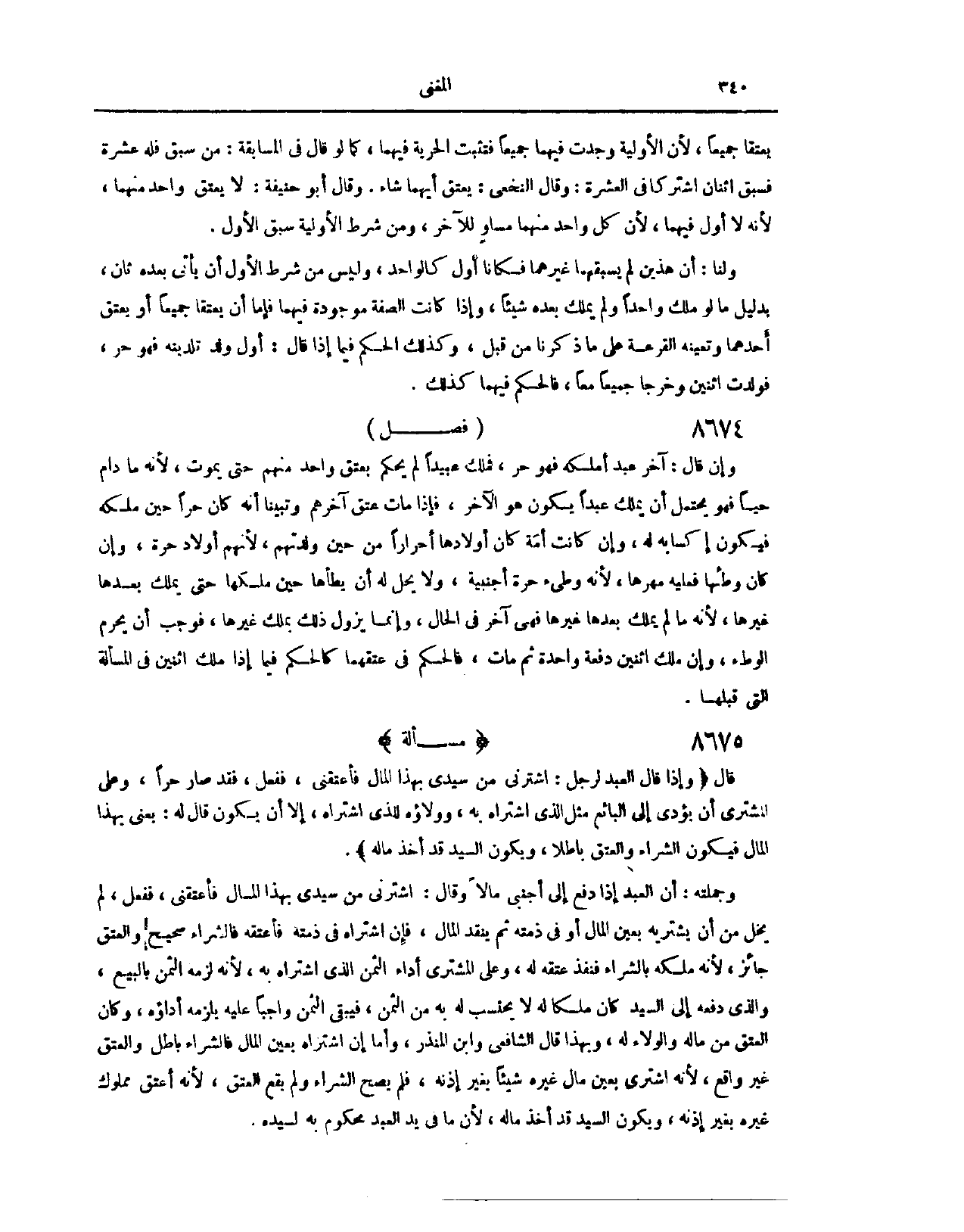 . (٨٦٤٩) فَصْلٌ: وَإِنْ قَالَ: آخِرُ عَبْدٍ أَمْلِكُهُ، فَهُوَ حُرٌّ. فَمَلَكَ عَبِيدًا، لَمْ يُحْكَمْ بِعِتْقِ وَاحِدٍ مِنْهُمْ حَتَّى يَمُوتَ؛ لِأَنَّهُمَا حَيًّا، فَهُوَ يَحْتَمِلُ أَنْ يَمْلِكَ عَبْدًا يَكُونُ هُوَ الْآخِرَ، فَإِذَا مَاتَ، عَتَقَ آخِرُهُمْ وَتَبَيَّنَّا أَنَّهُ كَانَ حُرًّا حِينَ مَلَكَهُ، فَيَكُونُ إكْسَابَهُ لَهُ. وَإِنْ كَانَتْ أَمَةً كَانَ أَوْلَادُهَا أَحْرَارًا مِنْ حِينَ وَلَدَتْهُمْ؛ لِأَنَّهُمْ أَوْلَادُ حُرَّةٍ. وَإِنْ كَانَ وَطِئَهَا، فَعَلَيْهِ مَهْرُهَا؛ لِأَنَّهُ وَطِئَ حُرَّةً أَجْنَبِيَّةً، وَلَا يَحِلُّ لَهُ أَنْ يَطَأَهَا حِينَ مَلَكَهَا، حَتَّى يَمْلِكَ بَعْدَهَا غَيْرَهَا؛ لِأَنَّهُمَا يَمْلِكْ بَعْدَهَا غَيْرَهَا، فَهِيَ آخِرٌ فِي الْحَالِ، وَإِنَّمَا يَزُولُ ذَلِكَ بِمِلْكِ غَيْرِهَا، فَوَجَبَ أَنْ يَحْرُمَ الْوَطْءُ. وَإِنْ مَلَكَ اثْنَيْنِ، دُفْعَةً وَاحِدَةً ثُمَّ مَاتَ، فَالْحُكْمُ فِي عِتْقِهِمَا، كَالْحُكْمِ فِيمَا إذَا مَلَكَ اثْنَيْنِ فِي الْمَسْأَلَةِ الَّتِي قَبْلَهَا.