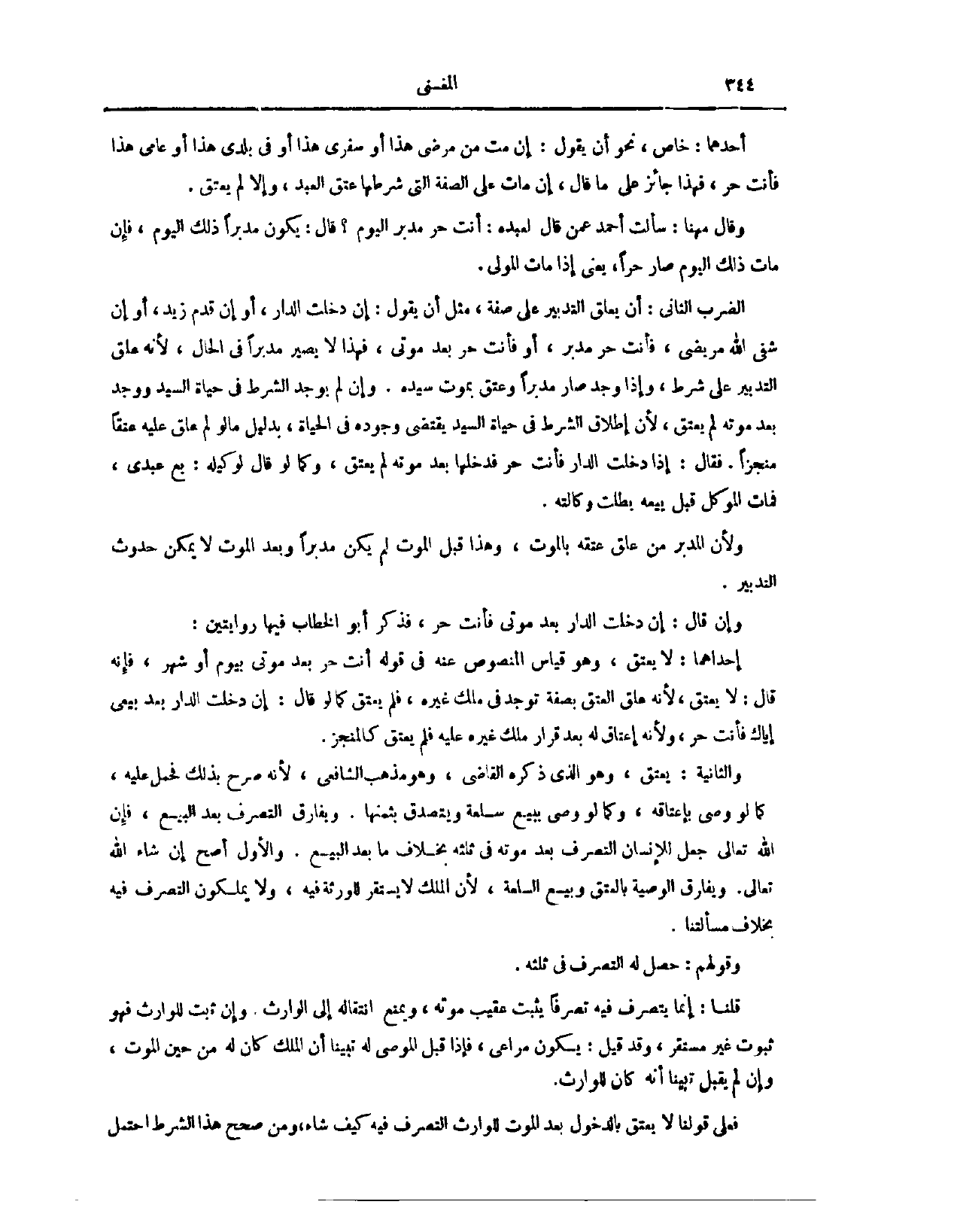 وَقَوْلُهُمْ: حَصَلَ لَهُ التَّصَرُّفُ فِي ثُلُثِهِ. قُلْنَا: إنَّمَا يَتَصَرَّفُ فِيهِ تَصَرُّفًا يَثْبُتُ عَقِيبَ مَوْتِهِ، وَيَمْنَعُ انْتِقَالَهُ إلَى الْوَارِثِ، وَإِنْ ثَبَتَ لِلْوَارِثِ، فَهُوَ ثُبُوتٌ غَيْرُ مُسْتَقِرٍّ، وَقَدْ قِيلَ: يَكُونُ مُرَاعًى، فَإِذَا قَبِلَ الْمُوصَى لَهُ، تَبَيَّنَّا أَنَّ الْمِلْكَ كَانَ لَهُ مِنْ حِينِ الْمَوْتِ. وَإِنْ لَمْ يَقْبَلْ، تَبَيَّنَّا أَنَّهُ كَانَ لِلْوَارِثِ. فَعَلَى قَوْلِنَا: لَا يَعْتِقُ بِالدُّخُولِ بَعْدَ الْمَوْتِ. لِلْوَارِثِ التَّصَرُّفُ فِيهِ كَيْفَ شَاءَ، وَمَنْ صَحَّحَ هَذَا الشَّرْطَ، احْتَمَلَ