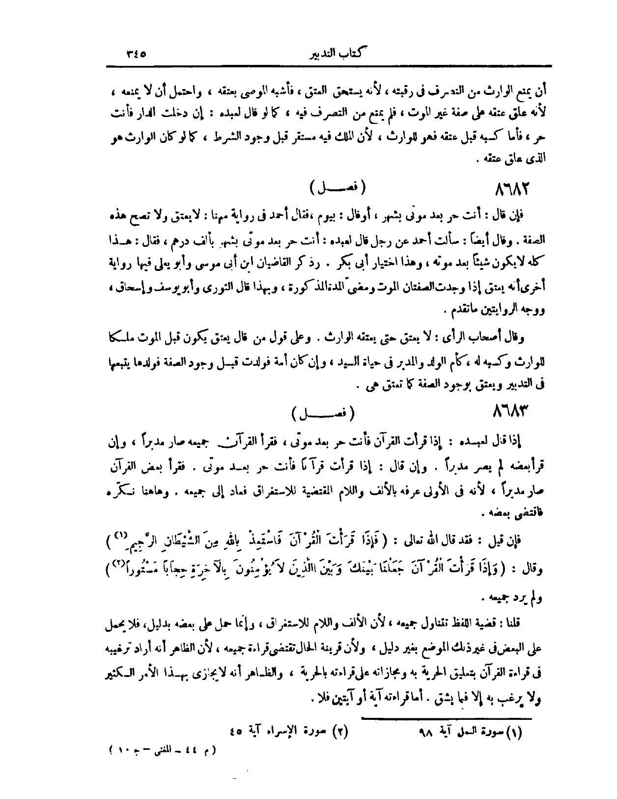 . (٨٦٥٨) فَصْلٌ: إذَا قَالَ لِعَبْدِهِ: إذَا قَرَأْت الْقُرْآنَ، فَأَنْتَ حُرٌّ بَعْدَ مَوْتِي. فَقَرَأَ الْقُرْآنَ جَمِيعَهُ، صَارَ مُدَبَّرًا، وَإِنْ قَرَأَ بَعْضَهُ، لَمْ يَصِرْ مُدَبَّرًا. وَإِنْ قَالَ إذَا قَرَأْت قُرْآنًا، فَأَنْتَ حُرٌّ بَعْدَ مَوْتِي فَقَرَأَ بَعْضَ الْقُرْآنِ، صَارَ مُدَبَّرًا؛ لِأَنَّهُ فِي الْأُولَى عَرَّفَهُ بِالْأَلِفِ وَاللَّامِ الْمُقْتَضِيَةِ لِلِاسْتِغْرَاقِ، فَعَادَ إلَى جَمِيعِهِ، وَهَا هُنَا نَكَّرَهُ، فَاقْتَضَى بَعْضَهُ. فَإِنْ قِيلَ: فَقَدْ قَالَ اللَّهُ تَعَالَى {فَإِذَا قَرَأْتَ الْقُرْآنَ فَاسْتَعِذْ بِاللَّهِ مِنَ الشَّيْطَانِ الرَّجِيمِ} [النحل: ٩٨] . وَقَالَ: {وَإِذَا قَرَأْتَ الْقُرْآنَ جَعَلْنَا بَيْنَكَ وَبَيْنَ الَّذِينَ لا يُؤْمِنُونَ بِالآخِرَةِ حِجَابًا مَسْتُورًا} [الإسراء: ٤٥] وَلَمْ يُرِدْ جَمِيعَهُ. قُلْنَا قَضِيَّةُ اللَّفْظِ تَتَنَاوَلُ جَمِيعَهُ؛ لِأَنَّ الْأَلِفَ وَاللَّامَ لِلِاسْتِغْرَاقِ، وَإِنَّمَا حُمِلَ عَلَى بَعْضِهِ بِدَلِيلٍ، فَلَا يُحْمَلُ عَلَى الْبَعْضِ فِي غَيْرِ ذَلِكَ الْمَوْضِعِ بِغَيْرِ دَلِيلٍ، وَلِأَنَّ قَرِينَةَ الْحَالِ تَقْتَضِي قِرَاءَةَ جَمِيعِهِ؛ لِأَنَّ الظَّاهِرَ أَنَّهُ أَرَادَ تَرْغِيبَهُ فِي قِرَاءَةِ الْقُرْآنِ، بِتَعْلِيقِ الْحُرِّيَّةِ بِهِ، وَمُجَازَاتِهِ عَلَى قِرَاءَتِهِ بِالْحُرِّيَّةِ، وَالظَّاهِرُ أَنَّهُ لَا يُجَازِي بِهَذَا الْأَمْرِ الْكَثِيرِ، وَلَا يُرَغِّبُ بِهِ، إلَّا فِيمَا يَشُقُّ، أَمَّا قِرَاءَتُهُ آيَةً أَوْ آيَتَيْنِ فَلَا.