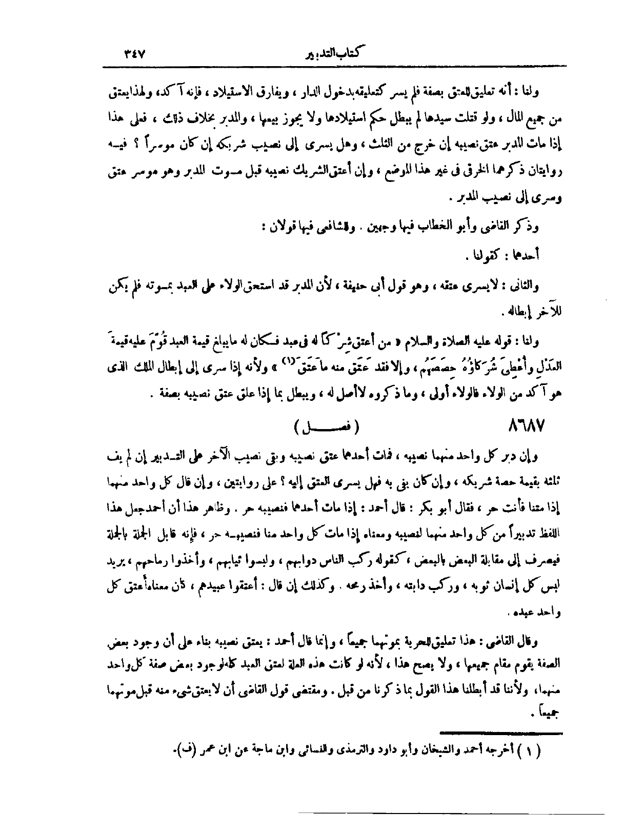 (٨٦٦٢) فَصْلٌ: وَإِنْ دَبَّرَ كُلُّ وَاحِدٍ مِنْهُمَا نَصِيبَهُ، فَمَاتَ أَحَدُهُمَا، عَتَقَ نَصِيبُهُ، وَبَقِيَ نَصِيبُ الْآخَرِ عَلَى التَّدْبِيرِ، إنْ لَمْ يَفِ ثُلُثُهُ بِقِيمَةِ حِصَّةِ شَرِيكِهِ، وَإِنْ كَانَ يَفِي بِهِ، فَهَلْ يَسْرِي الْعِتْقُ إلَيْهِ. عَلَى رِوَايَتَيْنِ. وَإِنْ قَالَ كُلُّ وَاحِدٍ مِنْهُمَا: إذَا مُتْنَا، فَأَنْتَ حُرٌّ. فَقَالَ أَبُو بَكْرٍ: قَالَ أَحْمَدُ: إذَا مَاتَ أَحَدُهُمَا، فَنَصِيبُهُ حُرٌّ. وَظَاهِرُ هَذَا أَنَّ أَحْمَدَ جَعَلَ هَذَا اللَّفْظَ تَدْبِيرًا مِنْ كُلِّ وَاحِدٍ مِنْهُمَا لِنَصِيبِهِ، وَمَعْنَاهُ إذَا مَاتَ كُلُّ وَاحِدٍ مِنَّا، فَنَصِيبُهُ حُرٌّ؛ فَإِنَّهُ قَابَلَ الْجُمْلَةَ بِالْجُمْلَةِ، فَيَصْرِفُ إلَى مُقَابَلَةِ الْبَعْضِ، كَقَوْلِهِ: رَكِبَ النَّاسُ دَوَابَّهُمْ، وَلَبِسُوا ثِيَابَهُمْ، وَأَخَذُوا رِمَاحَهُمْ. يُرِيدُ لَبِسَ كُلُّ إنْسَانٍ ثَوْبَهُ، وَرَكِبَ دَابَّتَهُ وَأَخَذَ رُمْحَهُ. وَكَذَلِكَ إنْ قَالَ: أَعْتَقُوا عَبِيدَهُمْ. كَانَ مَعْنَاهُ، أَعْتَقَ كُلُّ وَاحِدٍ عَبْدَهُ وَقَالَ الْقَاضِي: هَذَا تَعْلِيقٌ لِلْحُرِّيَّةِ بِمَوْتِهِمَا جَمِيعًا، وَإِنَّمَا قَالَ أَحْمَدُ: يَعْتِقُ نَصِيبُهُ؛ بِنَاءً عَلَى أَنَّ وُجُودَ بَعْضِ الصِّفَةِ يَقُومُ مَقَامَ جَمِيعِهَا. وَلَا يَصِحُّ هَذَا؛ لِأَنَّهُ لَوْ كَانَتْ هَذِهِ الْعِلَّةَ، لَعَتَقَ الْعَبْدُ كُلُّهُ، لِوُجُودِ بَعْضِ صِفَةِ كُلِّ وَاحِدٍ مِنْهُمَا، وَلِأَنَّنَا قَدْ أَبْطَلْنَا هَذَا الْقَوْلَ بِمَا ذَكَرْنَا مِنْ قَبْلُ، وَمُقْتَضَى قَوْلِ الْقَاضِي أَنْ لَا يَعْتِقَ شَيْءٌ مِنْهُ قَبْلَ مَوْتِهِمَا جَمِيعًا.