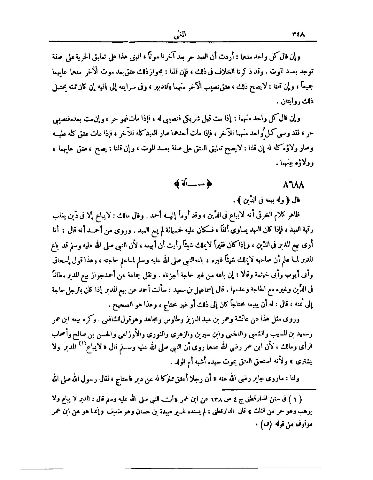 (٨٦٦٣) مَسْأَلَةٌ؛ قَالَ: (وَلَهُ بَيْعُهُ فِي الدَّيْنِ) ظَاهِرُ كَلَامِ الْخِرَقِيِّ، أَنَّهُ لَا يُبَاعُ فِي الدَّيْنِ. وَقَدْ أَوْمَأَ إلَيْهِ أَحْمَدُ. وَقَالَ مَالِكٌ: لَا يُبَاعُ إلَّا فِي دَيْنٍ يَغْلِبُ رَقَبَةَ الْعَبْدِ، فَإِذَا كَانَ الْعَبْدُ يُسَاوِي أَلْفًا، فَكَانَ عَلَيْهِ خَمْسُمِائَةٍ، لَمْ يَبِعْ الْعَبْدَ. وَرُوِيَ عَنْ أَحْمَدَ، أَنَّهُ قَالَ: أَنَا أَرَى بَيْعَ الْمُدَبَّرِ فِي الدَّيْنِ، وَإِذَا كَانَ فَقِيرًا لَا يَمْلِكُ شَيْئًا، رَأَيْت أَنْ أَبِيعَهُ؛ لِأَنَّ النَّبِيَّ - صَلَّى اللَّهُ عَلَيْهِ وَسَلَّمَ - قَدْ بَاعَ الْمُدَبَّرَ، لَمَّا عَلِمَ أَنَّ صَاحِبَهُ لَا يَمْلِكُ شَيْئًا غَيْرَهُ، بَاعَهُ النَّبِيُّ - صَلَّى اللَّهُ عَلَيْهِ وَسَلَّمَ - لَمَّا عَلِمَ حَاجَتَهُ. وَهَذَا قَوْلُ إِسْحَاقَ، وَأَبِي أَيُّوبَ وَأَبِي خَيْثَمَةَ، وَقَالَا: إنْ بَاعَهُ مِنْ غَيْرِ حَاجَةٍ، أَجَزْنَاهُ. وَنَقَلَ جَمَاعَةٌ عَنْ أَحْمَدَ، جَوَازَ بَيْعِ الْمُدَبَّرِ مُطْلَقًا؛ فِي الدَّيْنِ وَغَيْرِهِ، مَعَ الْحَاجَةِ وَعَدَمِهَا. قَالَ إسْمَاعِيلُ بْنُ سَعِيدٍ: سَأَلْت أَحْمَدَ عَنْ بَيْعِ الْمُدَبَّرِ، إذَا كَانَ بِالرَّجُلِ حَاجَةٌ إلَى ثَمَنِهِ، قَالَ: لَهُ أَنْ يَبِيعَهُ، مُحْتَاجًا كَانَ إلَى ذَلِكَ أَوْ غَيْرَ مُحْتَاجٍ. وَهَذَا هُوَ الصَّحِيحُ.