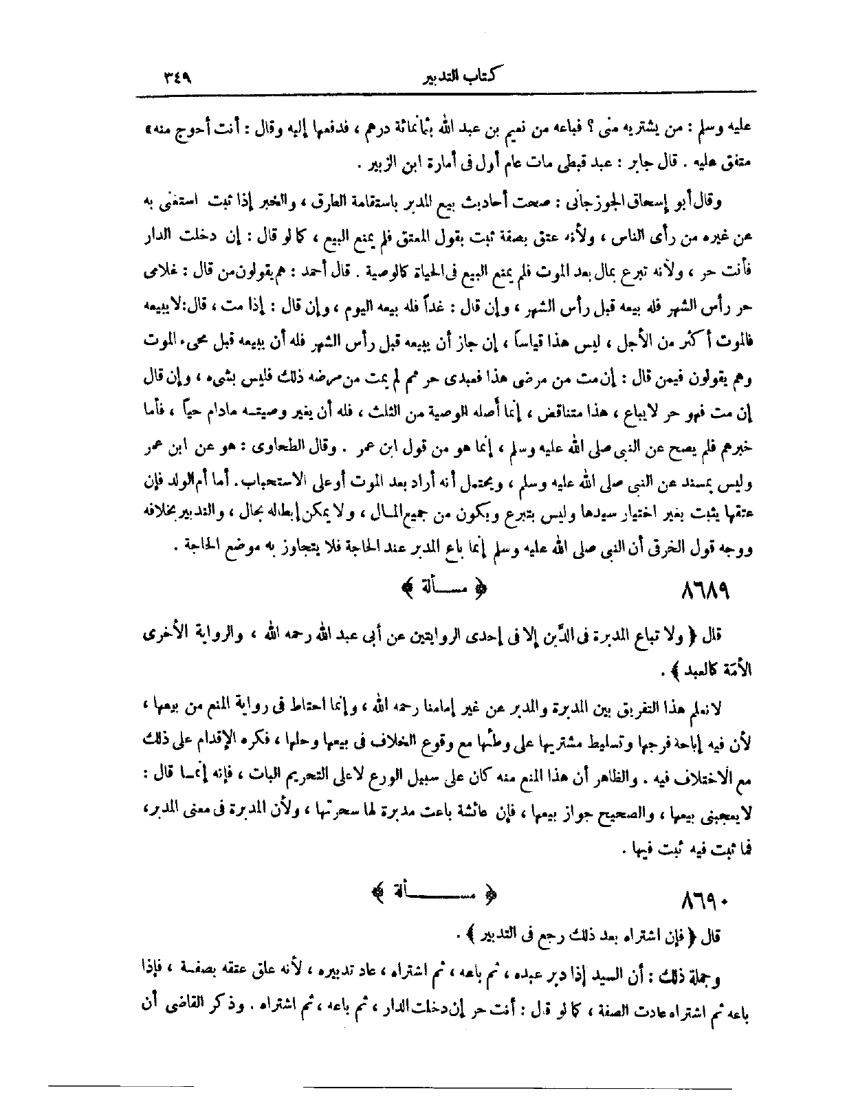 قَالَ الطَّحَاوِيُّ: هُوَ عَنْ ابْنِ عُمَرَ، وَلَيْسَ بِمُسْنَدٍ عَنْ النَّبِيِّ - صَلَّى اللَّهُ عَلَيْهِ وَسَلَّمَ -. وَيَحْتَمِلُ أَنَّهُ أَرَادَ بَعْدَ الْمَوْتِ، أَوْ عَلَى الِاسْتِحْبَابِ. أَمَّا أُمُّ الْوَلَدِ، فَإِنَّ عِتْقَهَا يَثْبُتُ بِغَيْرِ اخْتِيَارِ سَيِّدِهَا، وَلَيْسَ بِتَبَرُّعٍ، وَيَكُونُ مِنْ جَمِيعِ الْمَالِ، وَلَا يُمْكِنُ إبْطَالُهُ بِحَالٍ، وَالتَّدْبِيرُ بِخِلَافِهِ. وَوَجْهُ قَوْلِ الْخِرَقِيِّ، إنَّ النَّبِيَّ - صَلَّى اللَّهُ عَلَيْهِ وَسَلَّمَ - إنَّمَا بَاعَ الْمُدَبَّرَ عِنْدَ الْحَاجَةِ، فَلَا يُتَجَاوَزُ بِهِ مَوْضِعُ الْحَاجَةِ.