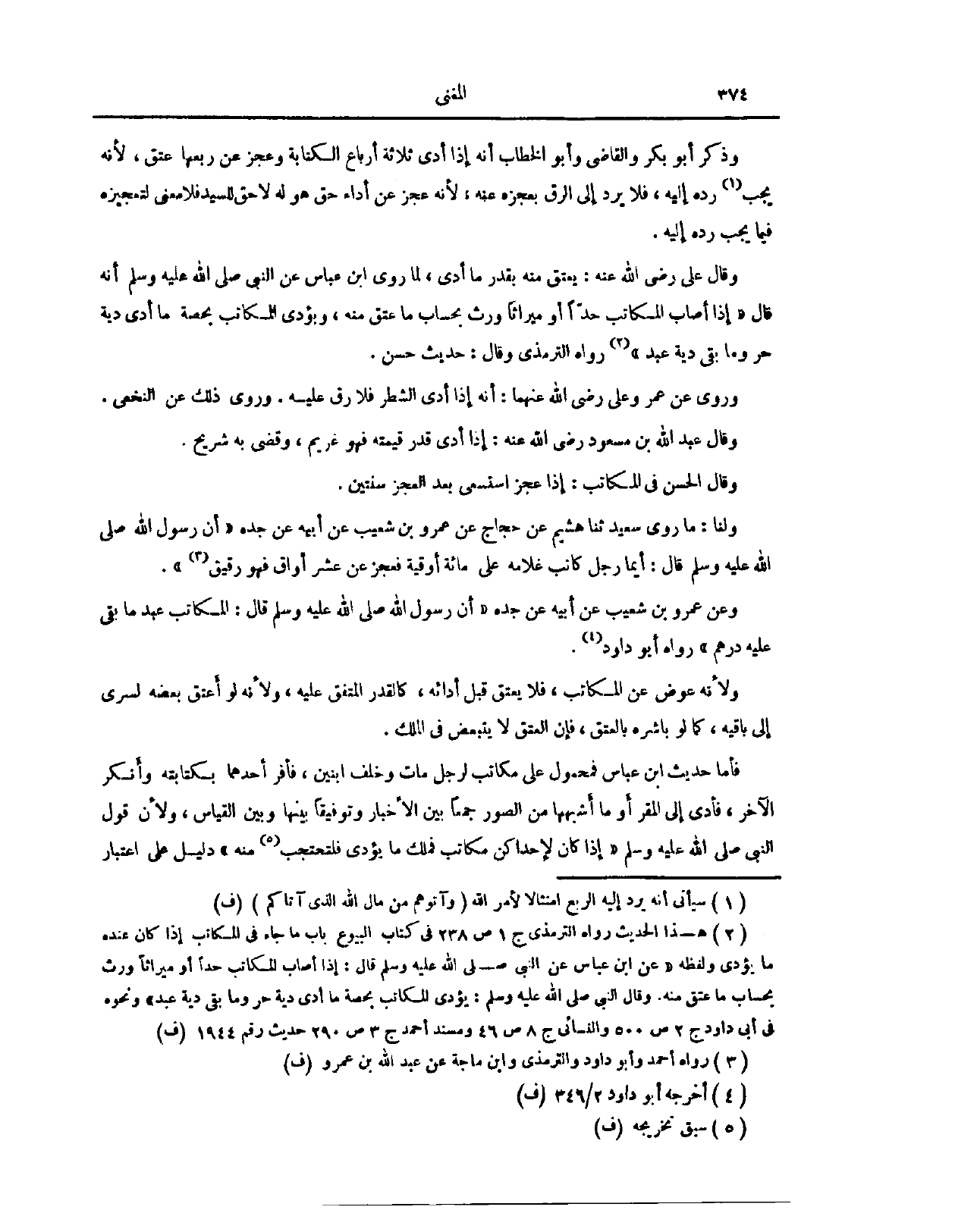 وَذَكَر أَبُو بَكْرٍ وَالْقَاضِي وَأَبُو الْخَطَّابِ أَنَّهُ إذَا أَدَّى ثَلَاثَةَ أَرْبَاعِ الْكِتَابَةِ، وَعَجَزَ عَنْ رُبُعِهَا عَتَقَ؛ لِأَنَّهُ يَجِبُ رَدُّهُ إلَيْهِ، فَلَا يُرَدُّ إلَى الرِّقِّ بِعَجْزِهِ عَنْهُ، لِأَنَّهُ عَجَزَ عَنْ أَدَاءِ حَقٍّ هُوَ لَهُ، لَا حَقٍّ لِلسَّيِّدِ، فَلَا مَعْنَى لِتَعْجِيزِهِ فِيمَا يَجِبُ رَدُّهُ إلَيْهِ.