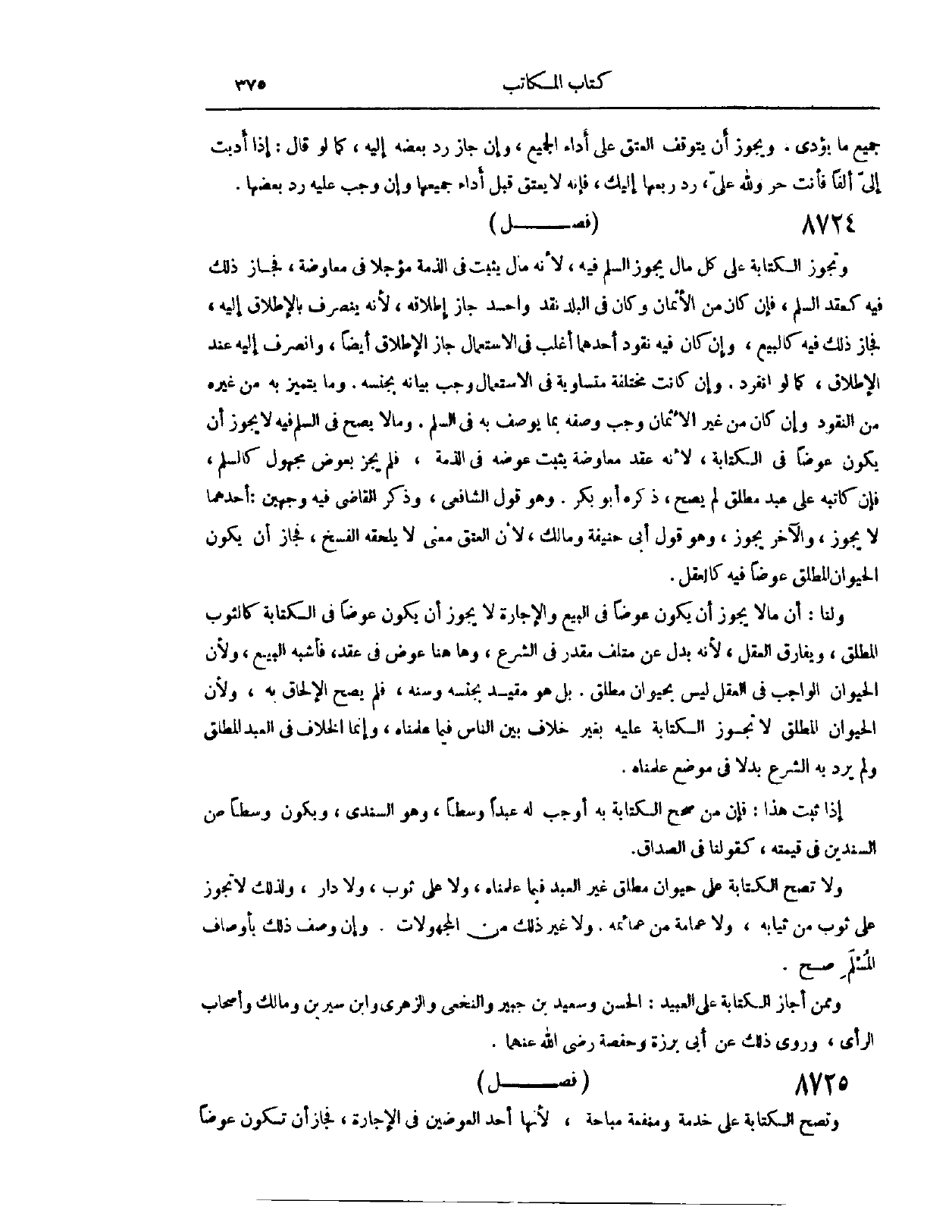 (٨٧٠٢) فَصْلٌ: وَتَجُوزُ الْكِتَابَةُ عَلَى كُلِّ مَالٍ يَجُوزُ السَّلَمُ فِيهِ؛ لِأَنَّهُ مَالٌ يَثْبُتُ فِي الذِّمَّةِ مُؤَجَّلًا فِي مُعَاوَضَةٍ، فَجَازَ ذَلِكَ فِيهِ، كَعَقْدِ السَّلَمِ. فَإِنْ كَانَ مِنْ الْأَثْمَانِ، وَكَانَ فِي الْبَلَدِ نَقْدٌ وَاحِدٌ، جَازَ إطْلَاقُهُ؛ لِأَنَّهُ يَنْصَرِفُ بِالْإِطْلَاقِ إلَيْهِ، فَجَازَ ذَلِكَ فِيهِ، كَالْبَيْعِ، وَإِنْ كَانَ فِيهِ نُقُودٌ أَحَدُهَا أَغْلَبُ فِي الِاسْتِعْمَالِ، جَازَ الْإِطْلَاقُ أَيْضًا، وَانْصَرَفَ إلَيْهِ عِنْدَ الْإِطْلَاقِ، كَمَا لَوْ انْفَرَدَ، وَإِنْ كَانَتْ مُخْتَلِفَةً مُتَسَاوِيَةً فِي الِاسْتِعْمَالِ، وَجَبَ بَيَانُهُ بِجِنْسِهِ، وَمَا يَتَمَيَّزُ بِهِ مِنْ غَيْرِهِ مِنْ النُّقُودِ. وَإِنْ كَانَ مِنْ غَيْرِ الْأَثْمَانِ، وَجَبَ وَصْفُهُ بِمَا يُوصَفُ بِهِ فِي السَّلَمِ.