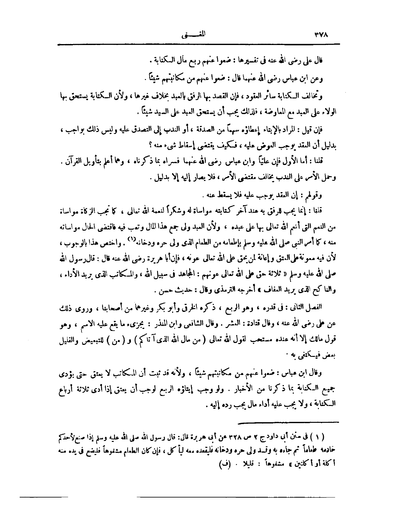 وَقَوْلُهُمْ: إنَّ الْعَقْدَ يُوجِبُ عَلَيْهِ، فَلَا يَسْقُطُ عَنْهُ. قُلْنَا: إنَّمَا يَجِبُ لِلرِّفْقِ بِهِ عِنْدَ آخِرِ كِتَابَتِهِ، مُوَاسَاةً لَهُ، وَشُكْرًا لِنِعْمَةِ اللَّهِ تَعَالَى، كَمَا تَجِبُ الزَّكَاةُ مُوَاسَاةً مِنْ النِّعَمِ الَّتِي أَنْعَمَ اللَّهُ تَعَالَى بِهَا عَلَى عَبْدِهِ، وَلِأَنَّ الْعَبْدَ وَلِيَ جَمْعَ هَذَا الْمَالِ، وَتَعِبَ فِيهِ، فَاقْتَضَى الْحَالُ مُوَاسَاتَهُ مِنْهُ، كَمَا أَمَرَ النَّبِيُّ - صَلَّى اللَّهُ عَلَيْهِ وَسَلَّمَ - بِإِطْعَامِهِ مِنْ الطَّعَامِ الَّذِي وَلِيَ حَرَّهُ وَدُخَانَهُ، وَاخْتَصَّ هَذَا بِالْوُجُوبِ؛ لِأَنَّ فِيهِ مَعُونَةً عَلَى الْعِتْقِ، وَإِعَانَةً لِمَنْ يَحِقُّ عَلَى اللَّهِ تَعَالَى عَوْنُهُ، فَإِنَّ أَبَا هُرَيْرَةَ، - رَضِيَ اللَّهُ عَنْهُ - قَالَ: قَالَ رَسُولُ اللَّهِ - صَلَّى اللَّهُ عَلَيْهِ وَسَلَّمَ -: «ثَلَاثَةٌ حَقٌّ عَلَى اللَّهِ تَعَالَى عَوْنُهُمْ، الْمُجَاهِدُ فِي سَبِيلِ اللَّهِ، وَالْمُكَاتَبُ الَّذِي يُرِيدُ الْأَدَاءَ، وَالنَّاكِحُ الَّذِي يُرِيدُ الْعَفَافَ» . أَخْرَجَهُ التِّرْمِذِيُّ، وَقَالَ: حَدِيثٌ حَسَنٌ.