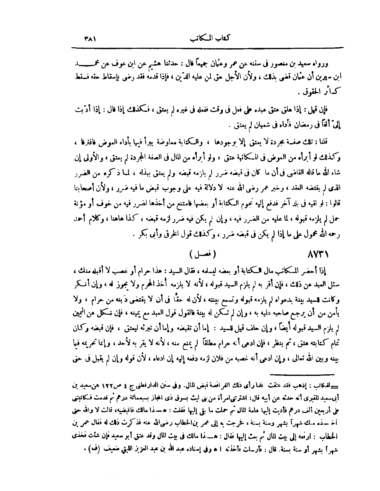 وَرَوَاهُ سَعِيدُ بْنُ مَنْصُورٍ، فِي سُنَنِهِ، عَنْ عُمَرَ وَعُثْمَانَ جَمِيعًا. قَالَ: حَدَّثَنَا هُشَيْمٌ، عَنْ ابْنِ عَوْفٍ، عَنْ مُحَمَّدِ بْنِ سِيرِينَ، أَنَّ عُثْمَانَ قَضَى بِذَلِكَ.