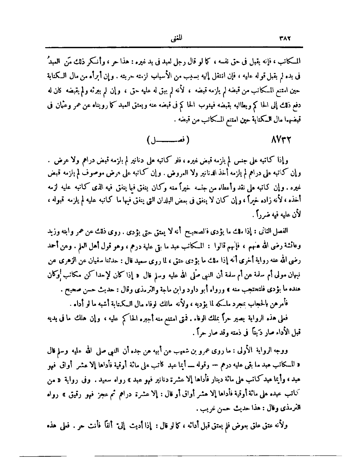 (٨٧١٧) الْفَصْلُ الثَّانِي: إذَا مَلَكَ مَا يُؤَدِّي، فَالصَّحِيحُ أَنَّهُ لَا يَعْتِقُ حَتَّى يُؤَدِّيَ. رُوِيَ ذَلِكَ عَنْ عُمَرَ، وَابْنِهِ وَزَيْدٍ، وَعَائِشَةَ - رَضِيَ اللَّهُ عَنْهُمْ -؛ فَإِنَّهُمْ قَالُوا: الْمُكَاتَبُ عَبْدٌ مَا بَقِيَ عَلَيْهِ دِرْهَمٌ. وَهُوَ قَوْلُ أَكْثَرِ أَهْلِ الْعِلْمِ، وَعَنْ أَحْمَدَ - رَضِيَ اللَّهُ عَنْهُ - رِوَايَةٌ أُخْرَى أَنَّهُ إذَا مَلَكَ مَا يُؤَدِّي، عَتَقَ؛ لِمَا رَوَى سَعِيدٌ، قَالَ: حَدَّثَنَا سُفْيَانُ عَنْ الزُّهْرِيِّ، عَنْ نَبْهَانَ مَوْلَى أُمِّ سَلَمَةَ، عَنْ أُمِّ سَلَمَةَ، أَنَّ النَّبِيَّ - صَلَّى اللَّهُ عَلَيْهِ وَسَلَّمَ - قَالَ: «إذَا كَانَ لِإِحْدَاكُنَّ مُكَاتَبٌ، وَكَانَ عِنْدَهُ مَا يُؤَدِّي، فَلْتَحْتَجِبْ مِنْهُ» . وَرَوَاهُ أَبُو دَاوُد، وَابْنُ مَاجَهْ، وَالتِّرْمِذِيُّ. وَقَالَ: حَدِيثٌ حَسَنٌ صَحِيحٌ. فَأَمَرَهُنَّ بِالْحِجَابِ بِمُجَرَّدِ مِلْكِهِ لِمَا يُؤَدِّيهِ، وَلِأَنَّهُ مَالِكٌ لِوَفَاءِ مَالِ الْكِتَابَةِ، أَشْبَهَ مَا لَوْ أَدَّاهُ. فَعَلَى هَذِهِ الرِّوَايَةِ، يَصِيرُ حُرًّا بِمِلْكِ الْوَفَاءِ فَمَتَى امْتَنَعَ مِنْهُ أَجْبَرَهُ الْحَاكِمُ عَلَيْهِ.