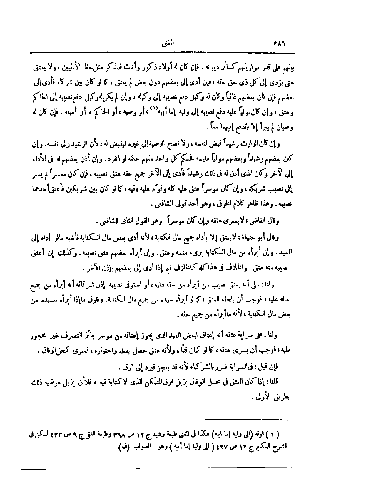 وَإِنْ أَذِنَ بَعْضُهُمْ لَهُ فِي الْأَدَاءِ إلَى الْآخَرِ، وَكَانَ الَّذِي أَذِنَ لَهُ فِي ذَلِكَ رَشِيدًا، فَأَدَّى إلَى الْآخَرِ جَمِيعَ حَقِّهِ، عَتَقَ نَصِيبُهُ، فَإِنْ كَانَ مُعْسِرًا، لَمْ يَسْرِ إلَى نَصِيبِ شَرِيكِهِ، وَإِنْ كَانَ مُوسِرًا، عَتَقَ عَلَيْهِ كُلُّهُ، وَقُوِّمَ عَلَيْهِ بَاقِيهِ، كَمَا لَوْ كَانَ بَيْنَ شَرِيكَيْنِ فَأَعْتَقَ أَحَدُهُمَا نَصِيبَهُ. وَهَذَا ظَاهِرُ كَلَامِ الْخِرَقِيِّ. وَهُوَ أَحَدُ قَوْلَيْ الشَّافِعِيِّ. وَقَالَ الْقَاضِي: لَا يَسْرِي عِتْقُهُ، وَإِنْ كَانَ مُوسِرًا. وَهُوَ الْقَوْلُ الثَّانِي لِلشَّافِعِيِّ. وَقَالَ أَبُو حَنِيفَةَ: لَا يَعْتِقُ إلَّا بِأَدَاءِ جَمِيعِ مَالِ الْكِتَابَةِ؛ لِأَنَّهُ أَدَّى بَعْضَ مَالِ الْكِتَابَةِ، فَأَشْبَهَ مَا لَوْ أَدَّاهُ إلَى السَّيِّدِ.