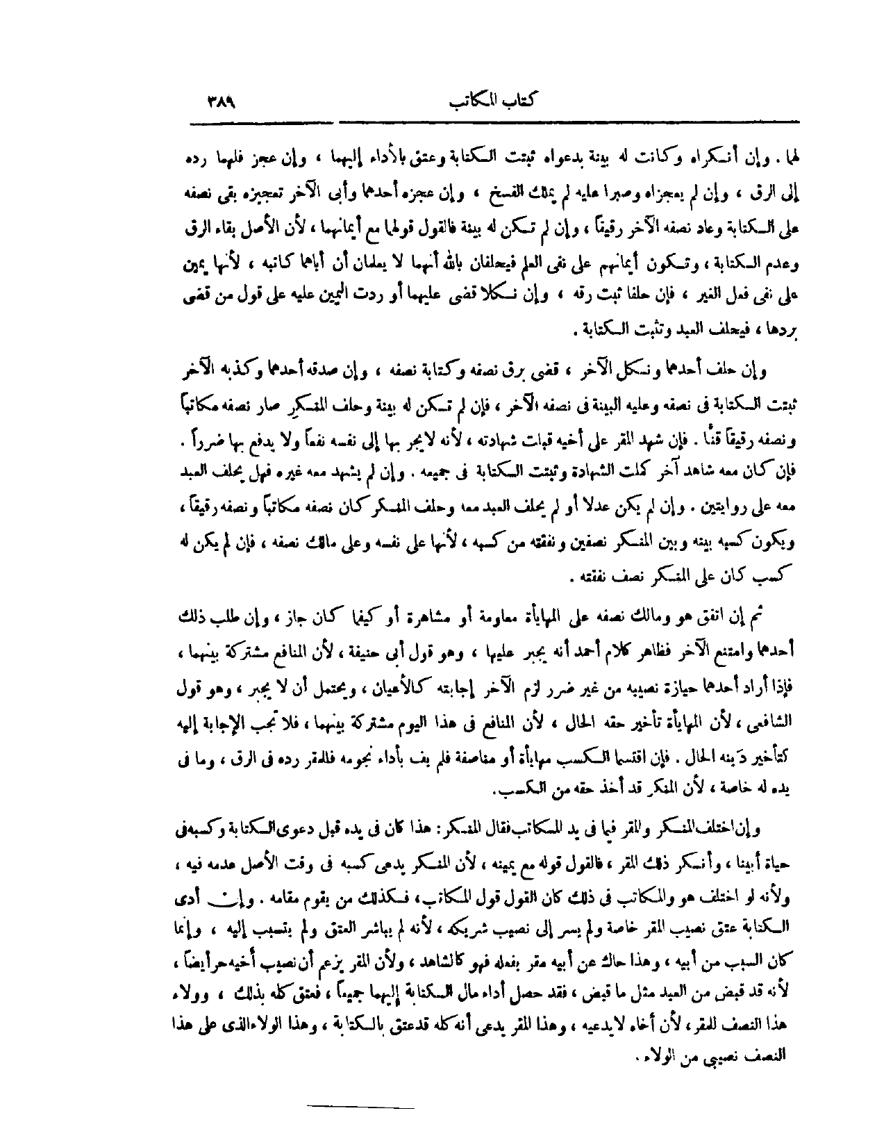 وَإِنْ اخْتَلَفَ الْمُنْكِرُ وَالْمُقِرُّ فِيمَا فِي يَدِ الْمُكَاتَبِ، فَقَالَ الْمُنْكِرُ: هَذَا كَانَ فِي يَدِهِ قَبْلَ دَعْوَى الْكِتَابَةِ وَكَسَبَهُ فِي حَيَاةِ أَبِينَا. وَأَنْكَرَ ذَلِكَ الْمُقِرُّ، فَالْقَوْلُ قَوْلُهُ مَعَ يَمِينِهِ؛ لِأَنَّ الْمُنْكِرَ يَدَّعِي كَسْبَهُ فِي وَقْتٍ، الْأَصْلُ عَدَمُهُ فِيهِ، وَلِأَنَّهُ لَوْ اخْتَلَفَ هُوَ وَالْمُكَاتَبُ فِي ذَلِكَ، كَانَ الْقَوْلُ قَوْلَ الْمُكَاتَبِ، فَكَذَلِكَ مَنْ يَقُومُ مَقَامَهُ. وَإِنْ أَدَّى الْكِتَابَةَ عَتَقَ نَصِيبُ الْمُقِرِّ خَاصَّةً، وَلَمْ يَسْرِ إلَى نَصِيبِ شَرِيكِهِ؛ لِأَنَّهُ لَمْ يُبَاشِرْ الْعِتْقَ، وَلَمْ يَتَسَبَّبْ إلَيْهِ، وَإِنَّمَا كَانَ السَّبَبُ مِنْ أَبِيهِ، وَهَذَا حَاكٍ عَنْ أَبِيهِ، مُقِرٌّ بِفِعْلِهِ، فَهُوَ كَالشَّاهِدِ، وَلِأَنَّ الْمُقِرَّ يَزْعُمُ أَنَّ نَصِيبَ أَخِيهِ حُرٌّ أَيْضًا؛ لِأَنَّهُ قَدْ قَبَضَ مِنْ الْعَبْدِ مِثْلَ مَا قَبَضَ، فَقَدْ حَصَلَ أَدَاءُ مَالِ الْكِتَابَةِ إلَيْهِمَا جَمِيعًا، فَعَتَقَ كُلُّهُ بِذَلِكَ، وَوَلَاءُ هَذَا النِّصْفِ لِلْمُقِرِّ لِأَنَّ أَخَاهُ لَا يَدَّعِيهِ وَهَذَا الْمُقِرُّ يَدَّعِي أَنَّهُ كُلَّهُ قَدْ عَتَقَ بِالْكِتَابَةِ، وَهَذَا الْوَلَاءُ الَّذِي عَلَى هَذَا النِّصْفِ نَصِيبِي مِنْ الْوَلَاءِ.