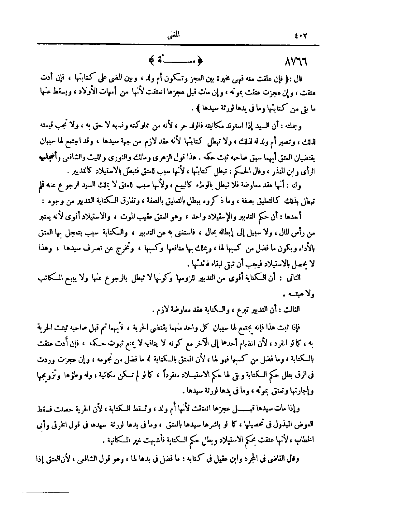 (٨٧٥٣) مَسْأَلَةٌ: قَالَ: (فَإِنْ عَلِقَتْ مِنْهُ، فَهِيَ مُخَيَّرَةٌ بَيْنَ الْعَجْزِ وَتَكُونُ أُمَّ وَلَدٍ، وَبَيْنَ الْمُضِيِّ عَلَى كِتَابَتِهَا. فَإِنْ أَدَّتْ عَتَقَتْ، وَإِنْ عَجَزَتْ عَتَقَتْ بِمَوْتِهِ. وَإِنْ مَاتَ قَبْلَ عَجْزِهَا انْعَتَقَتْ؛ لِأَنَّهَا مِنْ أُمَّهَاتِ الْأَوْلَادِ. وَيَسْقُطُ عَنْهَا مَا بَقِيَ مِنْ كِتَابَتَهَا وَمَا فِي يَدِهَا لِوَرَثَةِ سَيِّدِهَا) وَجُمْلَتُهُ أَنَّ السَّيِّدَ إذَا اسْتَوْلَدَ مُكَاتَبَتَهُ فَالْوَلَدُ حُرٌّ؛ لِأَنَّهُ مِنْ مَمْلُوكَتِهِ وَنَسَبُهُ لَاحِقٌ بِهِ وَلَا تَجِبُ قِيمَتُهُ؛ لِذَلِكَ وَتَصِيرُ أُمَّ وَلَدٍ لَهُ؛ لِذَلِكَ، وَلَا تَبْطُلُ كِتَابَتُهَا؛ لِأَنَّهُ عَقْدٌ لَازِمٌ مِنْ جِهَةِ سَيِّدِهَا وَقَدْ اجْتَمَعَ لَهَا سَبَبَانِ يَقْتَضِيَانِ الْعِتْقَ أَيُّهُمَا سَبَقَ صَاحِبَهُ ثَبَتَ حُكْمُهُ، هَذَا قَوْلُ الزُّهْرِيِّ وَمَالِكٍ وَالثَّوْرِيِّ وَاللَّيْثِ وَالشَّافِعِيِّ وَأَصْحَابِ الرَّأْيِ وَابْنِ الْمُنْذِرِ