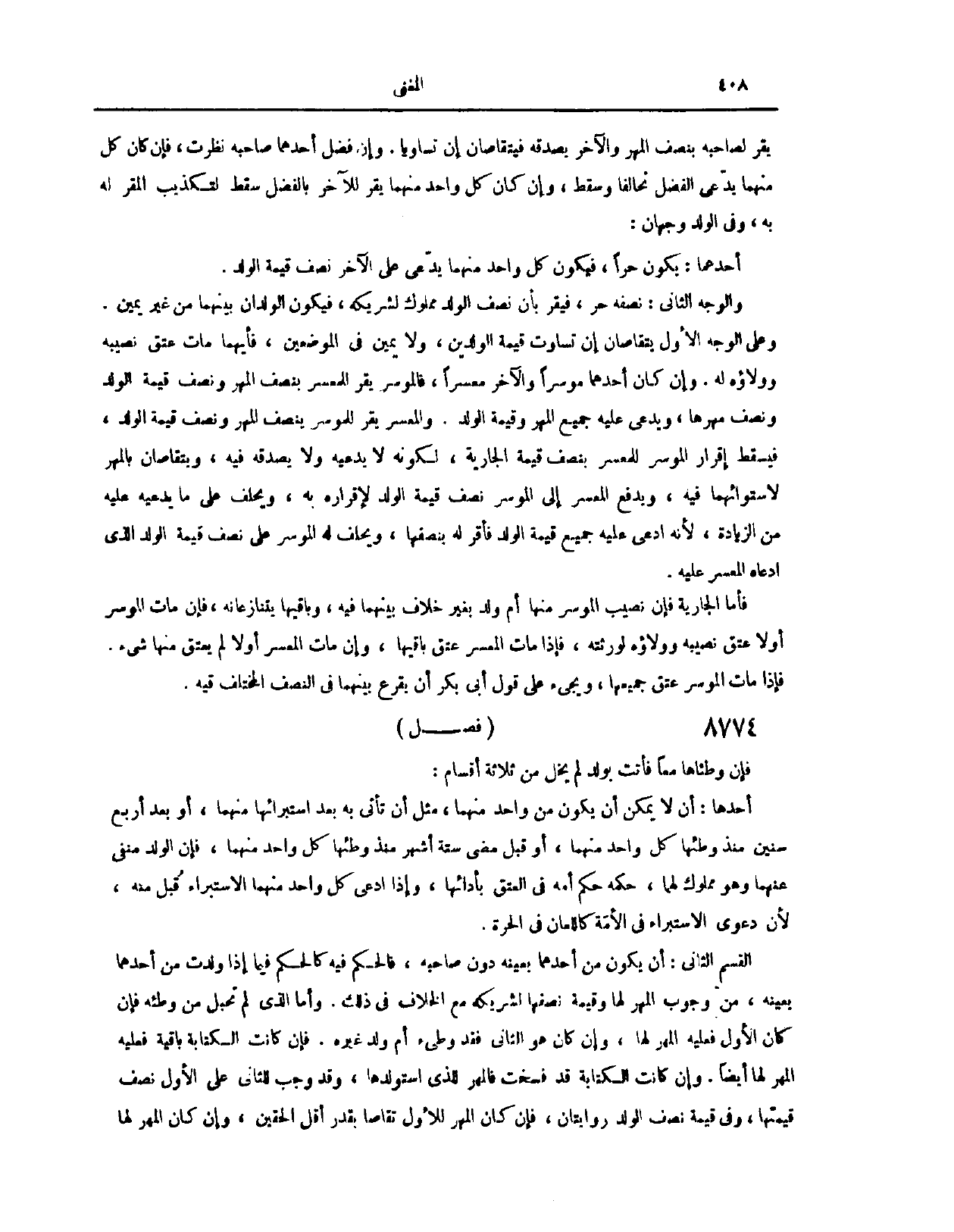 (٨٧٦١) فَصْلٌ: فَإِنْ وَطِئَاهَا مَعًا فَأَتَتْ بِوَلَدٍ لَمْ يَخْلُ مِنْ ثَلَاثَةِ أَقْسَامٍ: أَحَدُهَا أَنْ لَا يُمْكِنَ أَنْ يَكُونَ مِنْ وَاحِدٍ مِنْهُمَا، مِثْلُ أَنْ تَأْتِيَ بِهِ بَعْدَ اسْتِبْرَائِهَا مِنْهُمَا أَوْ بَعْدَ أَرْبَعِ سِنِينَ مُنْذُ وَطِئَهَا كُلُّ وَاحِدٍ مِنْهُمَا، أَوْ قَبْلَ مُضِيِّ سِتَّةِ أَشْهُرٍ مُنْذُ وَطِئَهَا كُلُّ وَاحِدٍ مِنْهُمَا، فَإِنَّ الْوَلَدَ مَنْفِيٌّ عَنْهُمَا وَهُوَ مَمْلُوكٌ لَهُمَا حُكْمُهُ حُكْمُ أُمِّهِ فِي الْعِتْقِ بِأَدَائِهَا، وَإِذَا ادَّعَى كُلُّ وَاحِدٍ مِنْهُمَا الِاسْتِبْرَاءَ قُبِلَ مِنْهُ؛ لِأَنَّ دَعْوَى الِاسْتِبْرَاءِ فِي الْأَمَةِ كَاللِّعَانِ فِي الْحُرَّةِ. الْقِسْمُ الثَّانِي: أَنْ يَكُونَ مِنْ أَحَدِهِمَا بِعَيْنِهِ دُونَ صَاحِبِهِ فَالْحُكْمُ فِيهِ كَالْحُكْمِ فِيمَا إذَا وَلَدَتْ مِنْ أَحَدِهِمَا بِعَيْنِهِ؛ مِنْ وُجُوبِ الْمَهْرِ لَهَا وَقِيمَةِ نِصْفِهَا لِشَرِيكِهِ مَعَ الْخِلَافِ فِي ذَلِكَ