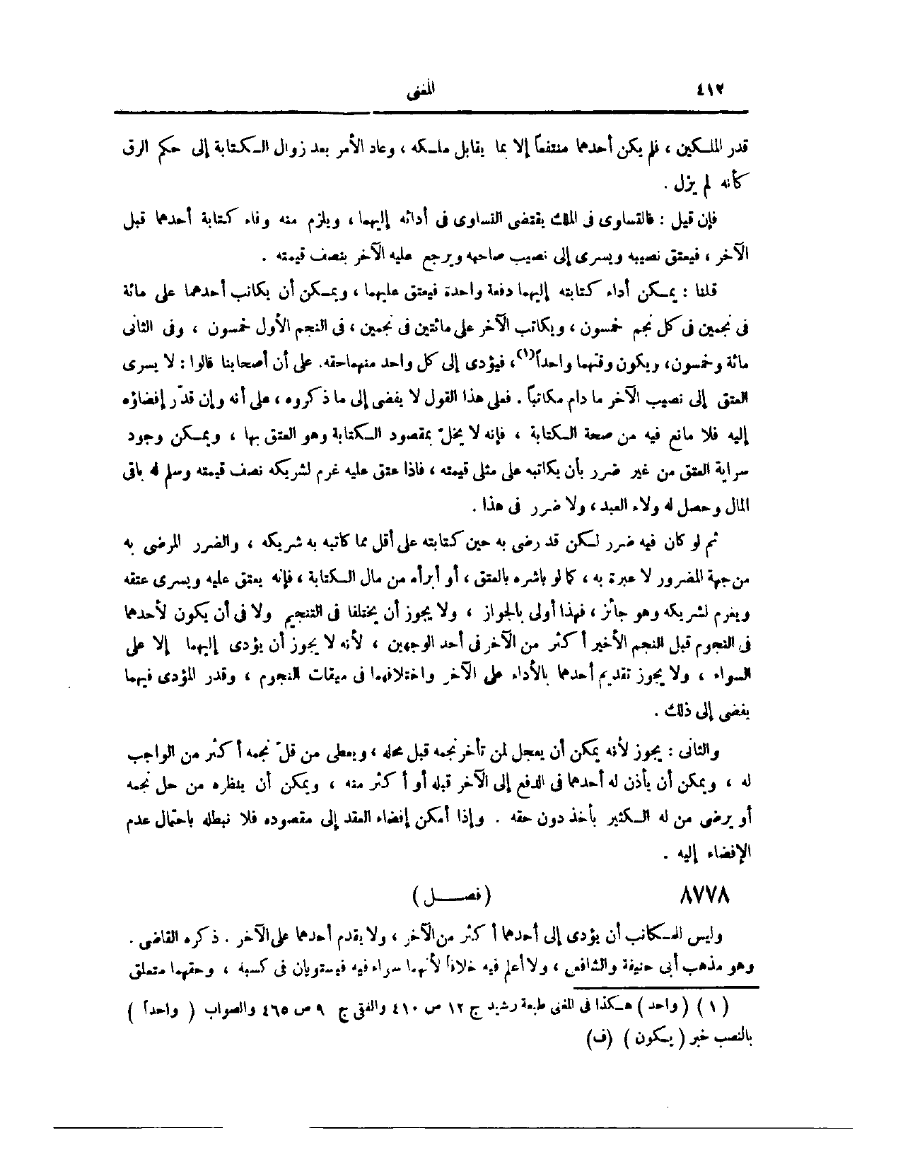 (٨٧٦٥) فَصْلٌ: وَلَيْسَ لِلْمُكَاتَبِ أَنْ يُؤَدِّيَ إلَى أَحَدِهِمَا أَكْثَرَ مِنْ الْآخَرِ، وَلَا يُقَدِّمَ أَحَدَهُمَا عَلَى الْآخَرِ. ذَكَرَهُ الْقَاضِي، وَهُوَ مَذْهَبُ أَبِي حَنِيفَةَ وَالشَّافِعِيِّ، وَلَا أَعْلَمُ فِيهِ خِلَافًا؛ لِأَنَّهُ مَا سَوَاءٌ فِيهِ فَيَسْتَوِيَانِ فِي كَسْبِهِ، وَحَقُّهُمَا مُتَعَلِّقٌ