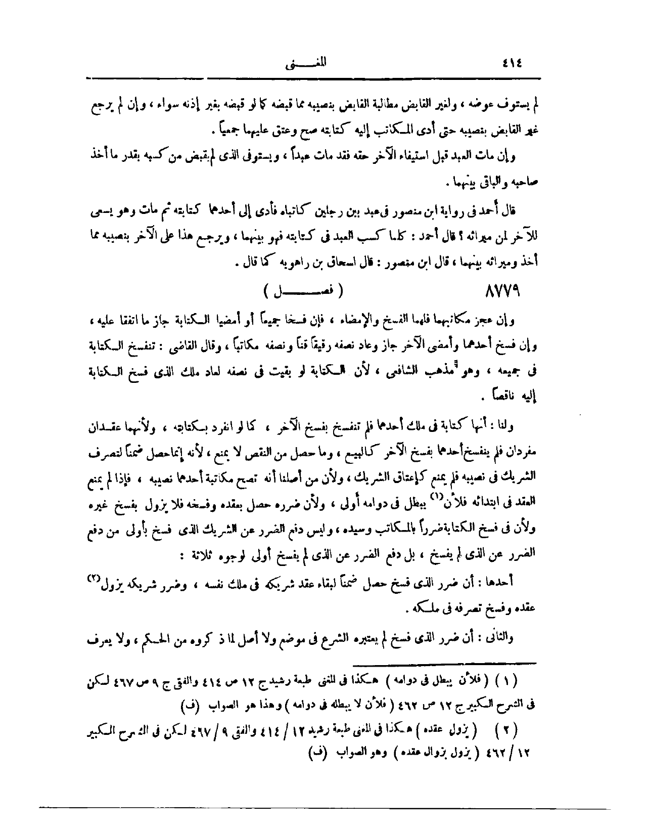 وَلَنَا، أَنَّهَا كِتَابَةٌ فِي مِلْكِ أَحَدِهِمَا فَلَمْ تَنْفَسِخْ بِفَسْخِ الْآخَرِ، كَمَا لَوْ انْفَرَدَ بِكِتَابَتِهِ، لِأَنَّهُمَا عَقْدَانِ مُفْرَدَانِ فَلَمْ يَنْفَسِخْ أَحَدُهُمَا بِفَسْخِ الْآخَرِ كَالْبَيْعِ، وَمَا حَصَلَ مِنْ النَّقْصِ لَا يَمْنَعُ؛ لِأَنَّهُ إنَّمَا حَصَلَ ضِمْنًا؛ لِتَصَرُّفِ الشَّرِيكِ فِي نَصِيبِهِ، فَلَمْ يَمْنَعْ كَإِعْتَاقِ الشَّرِيكِ؛ وَلِأَنَّ مِنْ أَصْلِنَا أَنَّهُ تَصِحُّ مُكَاتَبَةُ أَحَدِهِمَا نَصِيبَهُ، فَإِذَا لَمْ يُمْنَعْ الْعَقْدُ فِي ابْتِدَائِهِ فَلَأَنْ يَبْطُلَ فِي دَوَامِهِ أَوْلَى، وَلِأَنَّ ضَرَرَهُ حَصَلَ بِعَقْدِهِ وَفَسْخِهِ فَلَا يَزُولُ بِفَسْخِ عَقْدِ غَيْرِهِ، وَلِأَنَّ فِي فَسْخِ الْكِتَابَةِ ضَرَرًا بِالْمُكَاتَبِ وَسَيِّدِهِ، وَلَيْسَ دَفْعُ الضَّرَرِ عَنْ الشَّرِيكِ الَّذِي فَسَخَ بِأَوْلَى مِنْ دَفْعِ الضَّرَرِ عَنْ الَّذِي لَمْ يَفْسَخْ، بَلْ دَفْعُ الضَّرَرِ عَنْ الَّذِي لَمْ يَفْسَخْ أَوْلَى لِوُجُوهٍ ثَلَاثَةٍ: أَحَدُهَا أَنَّ ضَرَرَ الَّذِي فَسَخَ حَصَلَ ضِمْنًا؛ لِبَقَاءِ عَقْدِ شَرِيكِهِ فِي مِلْكِ نَفْسِهِ، وَضَرَرَ شَرِيكِهِ بِزَوَالِ عَقْدِهِ وَفَسْخِ تَصَرُّفِهِ فِي مِلْكِهِ.