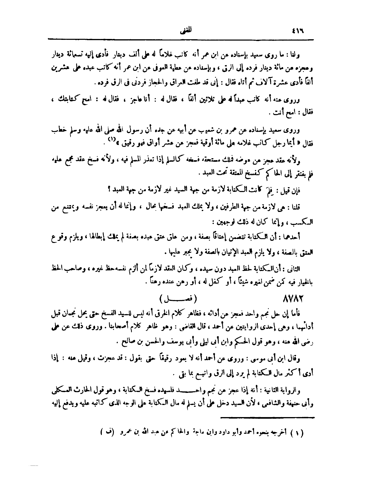 وَرَوَى سَعِيدٌ بِإِسْنَادِهِ عَنْ عَمْرِو بْنِ شُعَيْبٍ عَنْ أَبِيهِ عَنْ جَدِّهِ، «أَنَّ رَسُولَ اللَّهِ - صَلَّى اللَّهُ عَلَيْهِ وَسَلَّمَ - خَطَبَ فَقَالَ: أَيُّمَا رَجُلٍ كَاتَبَ غُلَامَهُ عَلَى مِائَةِ أُوقِيَّةٍ فَعَجَزَ عَنْ عَشْرِ أَوَاقٍ فَهُوَ رَقِيقٌ.» وَلِأَنَّهُ عَقْدٌ عَجَزَ عَنْ عِوَضِهِ فَمَلَكَ مُسْتَحِقُّهُ فَسْخَهُ كَالسَّلَمِ إذَا تَعَذَّرَ الْمُسْلِمُ فِيهِ، وَلِأَنَّهُ فَسْخُ عَقْدٍ مُجْمَعٌ عَلَيْهِ فَلَمْ يَفْتَقِرْ إلَى الْحَاكِمِ كَفَسْخِ الْمُعْتَقَةِ تَحْتَ الْعَبْدِ، فَإِنْ قِيلَ: فَلِمَ كَانَتْ الْكِتَابَةُ لَازِمَةً مِنْ جِهَةِ السَّيِّدِ، غَيْرَ لَازِمَةٍ مِنْ جِهَةِ الْعَبْدِ؟ قُلْنَا: هِيَ لَازِمَةٌ مِنْ جِهَةِ الطَّرَفَيْنِ وَلَا يَمْلِكُ الْعَبْدُ فَسْخَهَا بِحَالٍ وَإِنَّمَا لَهُ أَنْ يُعَجِّزَ نَفْسَهُ وَيَمْتَنِعَ مِنْ الْكَسْبِ، وَإِنَّمَا كَانَ لَهُ ذَلِكَ لِوَجْهَيْنِ - أَحَدُهُمَا: أَنَّ الْكِتَابَةَ تَتَضَمَّنُ إعْتَاقًا بِصِفَةٍ، وَمَنْ عَلَّقَ عِتْقَ عَبْدِهِ بِصِفَةٍ لَمْ يَمْلِكْ إبْطَالَهَا وَيَلْزَمُ وُقُوعُ الْعِتْقِ بِالصِّفَةِ، وَلَا يَلْزَمُ الْعَبْدَ الْإِتْيَانُ بِالصِّفَةِ وَلَا يُجْبَرُ عَلَيْهَا.