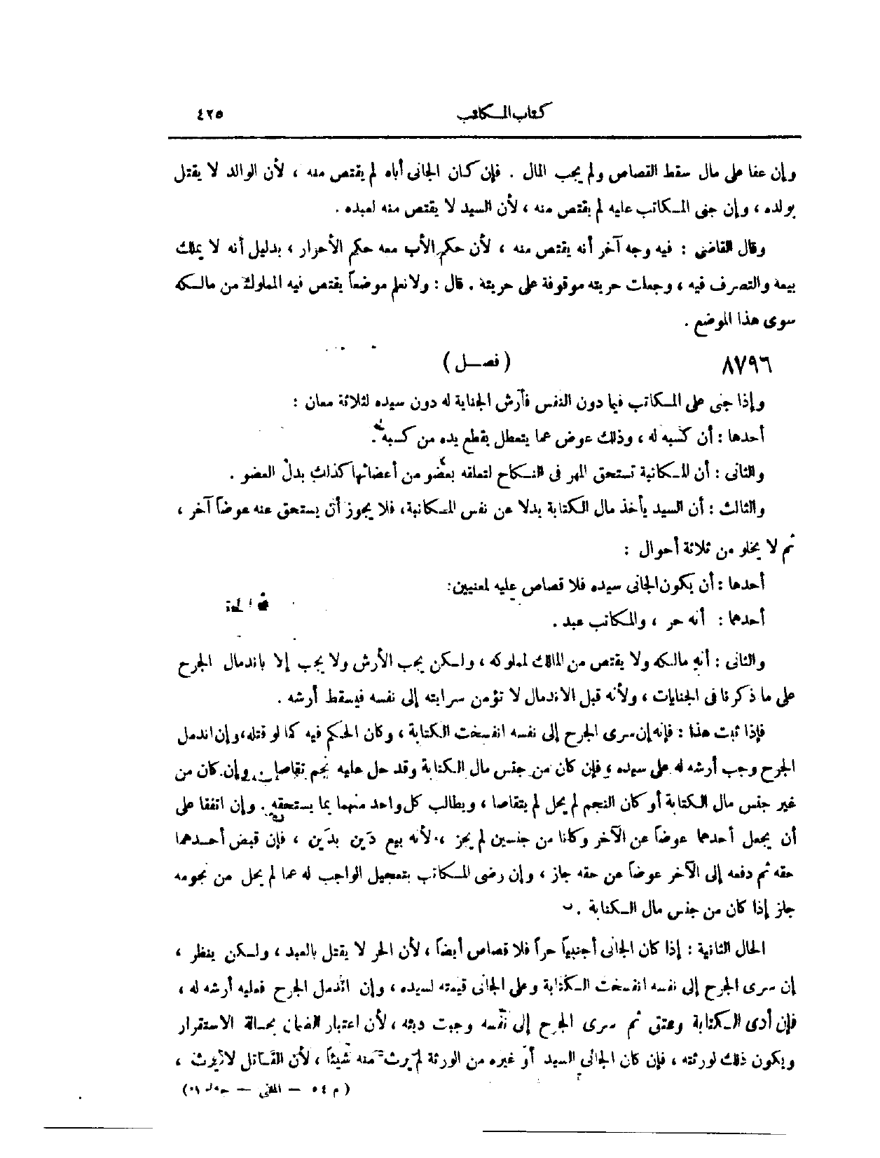 (٨٧٨٣) فَصْلٌ: وَإِذَا جُنِيَ عَلَى الْمُكَاتَبِ فِيمَا دُونَ النَّفْسِ، فَأَرْشُ الْجِنَايَةِ لَهُ، دُونَ سَيِّدِهِ، لِثَلَاثَةِ مَعَانٍ؛ أَحَدُهَا، أَنَّ كَسْبَهُ لَهُ، وَذَلِكَ عِوَضٌ عَمَّا يَتَعَطَّلُ بِقَطْعِ يَدِهِ مِنْ كَسْبِهِ. وَالثَّانِي، أَنَّ الْمُكَاتَبَةَ تَسْتَحِقُّ الْمَهْرَ فِي النِّكَاحِ، لِتَعَلُّقِهِ بِعُضْوٍ مِنْ أَعْضَائِهَا، كَذَلِكَ بَدَلُ الْعُضْوِ. وَالثَّالِثُ: أَنَّ السَّيِّدَ يَأْخُذُ مَالَ الْكِتَابَةِ بَدَلًا عَنْ نَفْسِ الْمُكَاتَبَةِ، فَلَا يَجُوزُ أَنْ يَسْتَحِقَّ عَنْهُ عِوَضًا آخَرَ. ثُمَّ لَا يَخْلُو مِنْ ثَلَاثَةِ أَحْوَالٍ؛ أَحَدُهَا، أَنْ يَكُونَ الْجَانِي سَيِّدَهُ، فَلَا قِصَاصَ عَلَيْهِ؛ لِمَعْنَيَيْنِ؛ أَحَدُهُمَا، أَنَّهُ حُرٌّ، وَالْمُكَاتَبَ عَبْدٌ. وَالثَّانِي، أَنَّهُ مَالِكُهُ، وَلَا يُقْتَصُّ مِنْ الْمَالِكِ لِمَمْلُوكِهِ، وَلَكِنْ يَجِبُ الْأَرْشُ، وَلَا يَجِبُ إلَّا بِانْدِمَالِ الْجُرْحِ، عَلَى مَا ذَكَرْنَا فِي الْجِنَايَات. وَلِأَنَّهُ قَبْلَ الِانْدِمَالِ لَا تُؤْمَنُ سِرَايَتُهُ إلَى نَفْسِهِ، فَيَسْقُطُ أَرْشُهُ. فَإِذَا ثَبَتَ هَذَا، فَإِنَّهُ إنْ سَرَى الْجُرْحُ إلَى نَفْسِهِ، انْفَسَخَتْ الْكِتَابَةُ، وَكَانَ الْحُكْمُ فِيهِ كَمَا لَوْ قَتَلَهُ.