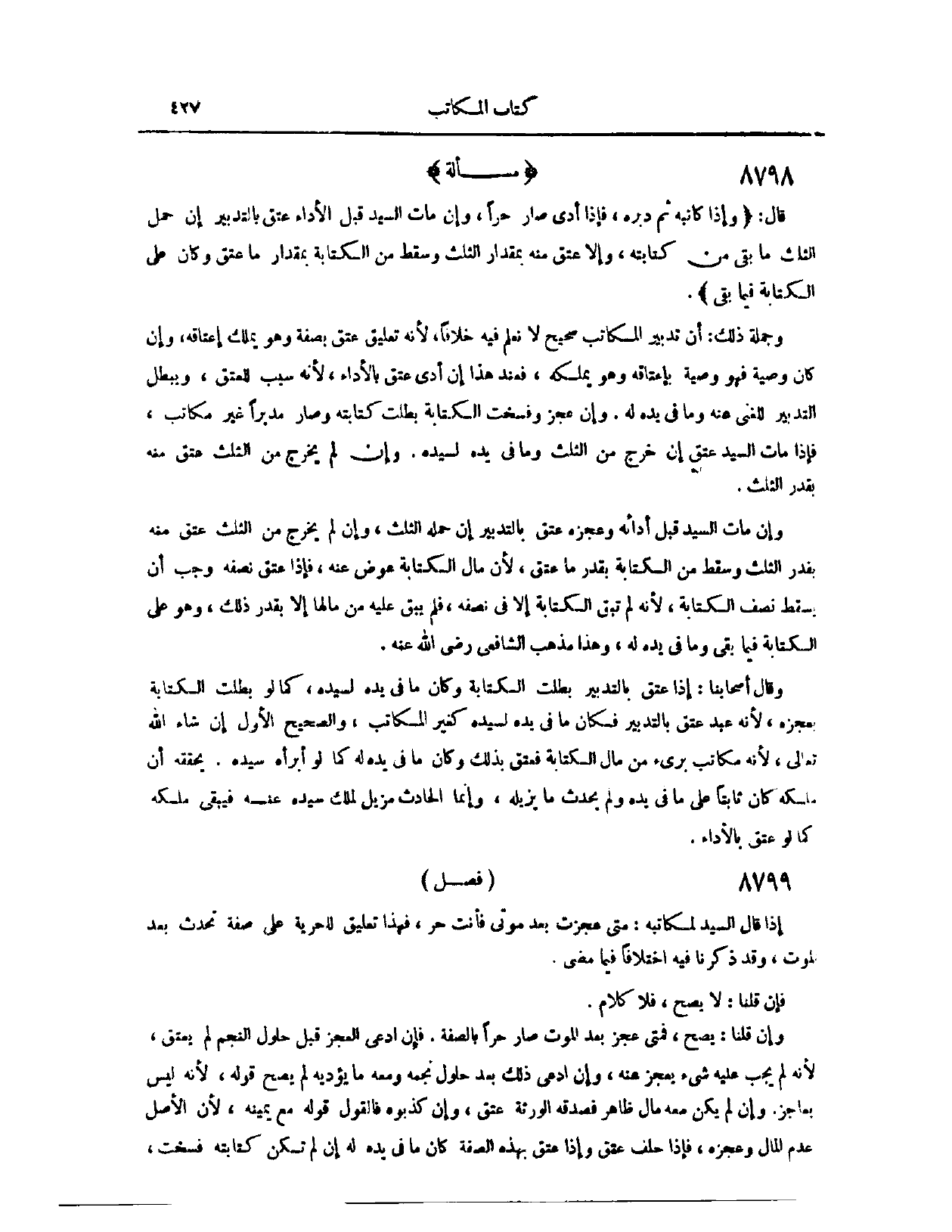 (٨٧٨٥) مَسْأَلَةٌ؛ قَالَ: وَإِذَا كَاتَبَهُ، ثُمَّ دَبَّرَهُ، فَإِذَا أَدَّى، صَارَ حُرًّا، وَإِنْ مَاتَ السَّيِّدُ قَبْلَ الْأَدَاءِ، عَتَقَ بِالتَّدْبِيرِ، إنْ حَمَلَ الثُّلُثَ، مَا بَقِيَ مِنْ كِتَابَتِهِ، وَإِلَّا عَتَقَ مِنْهُ بِمِقْدَارِ الثُّلُثِ، وَسَقَطَ مِنْ الْكِتَابَةِ بِمِقْدَارِ مَا عَتَقَ، وَكَانَ عَلَى الْكِتَابَةِ فِيمَا بَقِيَ وَجُمْلَةُ ذَلِكَ أَنَّ تَدْبِيرَ الْمُكَاتَبِ صَحِيحٌ. لَا نَعْلَمُ فِيهِ خِلَافًا؛ لِأَنَّهُ تَعْلِيقُ عِتْقٍ بِصِفَةِ، وَهُوَ يَمْلِكُ إعْتَاقَهُ، وَإِنْ كَانَ وَصِيَّةً، فَهُوَ وَصِيَّةٌ بِإِعْتَاقِهِ، وَهُوَ يَمْلِكُهُ. فَعِنْدَ هَذَا، إنْ أَدَّى عَتَقَ بِالْأَدَاءِ؛ لِأَنَّهُ سَبَبٌ لِلْعِتْقِ، وَيَبْطُلُ التَّدْبِيرُ لِلْغِنَى عَنْهُ، وَمَا فِي يَدِهِ لَهُ. وَإِنْ عَجَزَ، وَفُسِخَتْ الْكِتَابَةُ، بَطَلَتْ كِتَابَتُهُ، وَصَارَ مُدَبَّرًا غَيْرَ مُكَاتَبٍ. فَإِذَا مَاتَ السَّيِّدُ، عَتَقَ إنْ خَرَجَ مِنْ الثُّلُثِ، وَمَا فِي يَدِهِ لِسَيِّدِهِ.