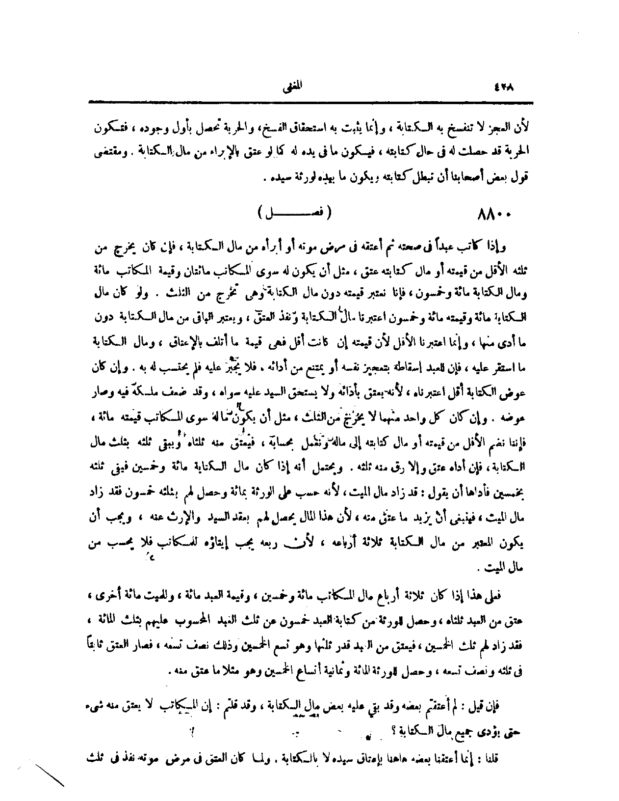 (٨٧٨٧) فَصْلٌ: وَإِذَا كَاتَبَ عَبْدًا فِي صِحَّتِهِ، ثُمَّ أَعْتَقَهُ فِي مَرَضِ مَوْتِهِ، أَوْ أَبْرَأَهُ مِنْ مَالِ الْكِتَابَةِ، فَإِنْ كَانَ يَخْرُجُ مِنْ ثُلُثِهِ الْأَقَلُّ مِنْ قِيمَتِهِ، أَوْ مَالِ كِتَابَتِهِ، عَتَقَ، مِثْلُ أَنْ يَكُونَ لَهُ سِوَى الْمُكَاتَبِ مِائَتَانِ، وَقِيمَةُ الْمُكَاتَبِ مِائَةٌ، وَمَالُ الْكِتَابَةِ مِائَةٌ وَخَمْسُونَ، فَإِنَّنَا نَعْتَبِرُ قِيمَتَهُ دُونَ مَالِ الْكِتَابَةِ، وَهِيَ تَخْرُجُ مِنْ الثُّلُثِ. وَلَوْ كَانَ مَالُ الْكِتَابَةِ مِائَةً، وَقِيمَتُهُ مِائَةٌ وَخَمْسُونَ، اعْتَبَرْنَا مَالَ الْكِتَابَةِ، وَنَفَذَ الْعِتْقُ، وَيُعْتَبَرُ الْبَاقِي مِنْ مَالِ الْكِتَابَةِ دُونَ مَا أَدَّى مِنْهَا. وَإِنَّمَا اعْتَبَرْنَا الْأَقَلَّ؛ لِأَنَّ قِيمَتَهُ إنْ كَانَتْ أَقَلَّ، فَهِيَ قِيمَةُ مَا أُتْلِفَ بِالْإِعْتَاقِ، وَمَالُ الْكِتَابَةِ مَا اسْتَقَرَّ عَلَيْهِ، فَإِنَّ لِلْعَبْدِ إسْقَاطَهُ بِتَعْجِيزِ نَفْسِهِ، أَوْ يَمْتَنِعُ مِنْ أَدَائِهِ، فَلَا يُجْبَرُ عَلَيْهِ، فَلَمْ يُحْتَسَبْ لَهُ بِهِ. وَإِنْ كَانَ عِوَضُ الْكِتَابَةِ أَقَلَّ، اعْتَبَرْنَاهُ؛ لِأَنَّهُ يَعْتِقُ بِأَدَائِهِ، وَلَا يَسْتَحِقُّ السَّيِّدُ عَلَيْهِ سِوَاهُ، وَقَدْ ضَعُفَ مِلْكُهُ فِيهِ، وَصَارَ عِوَضَهُ.