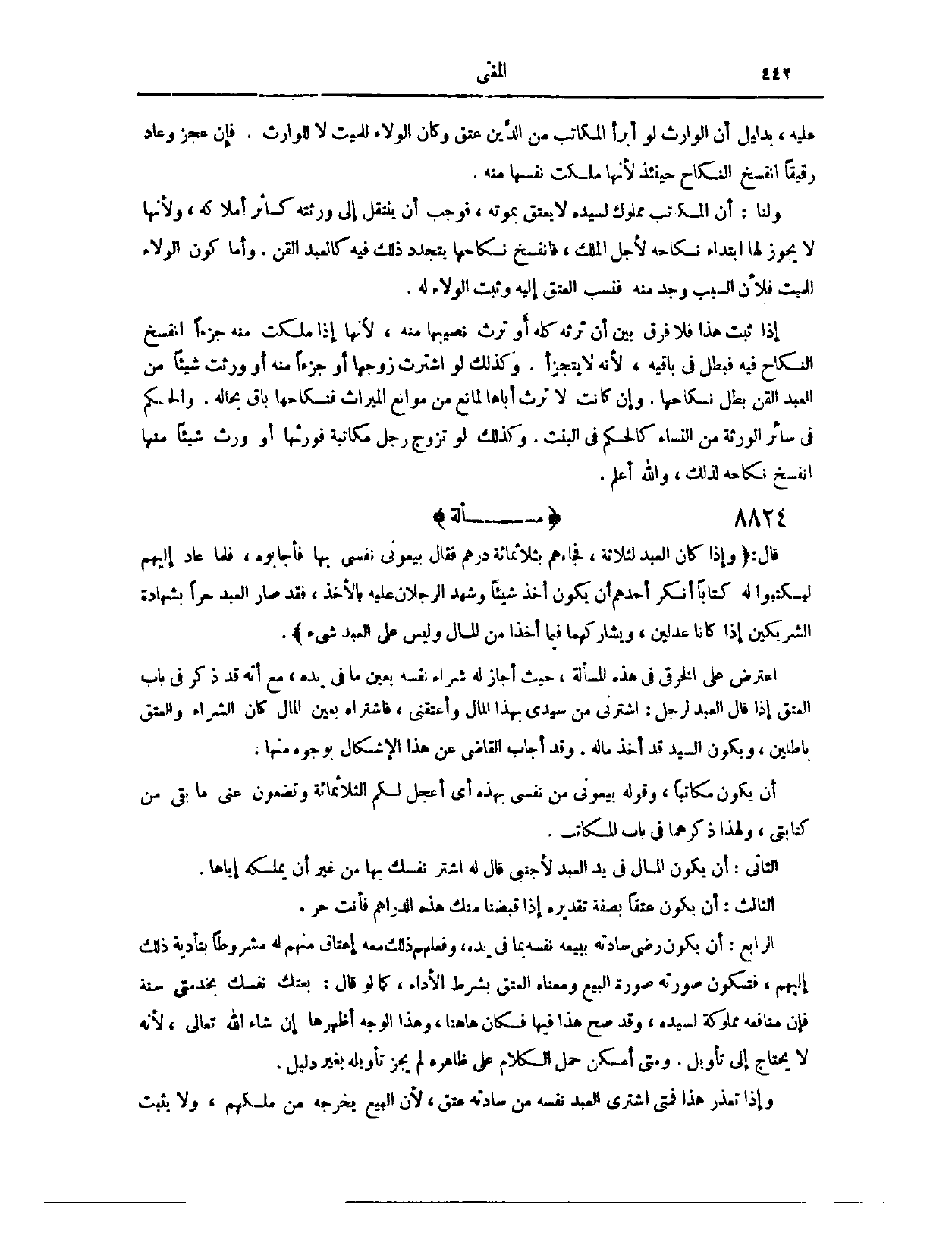 (٨٨١٣) مَسْأَلَةٌ؛ قَالَ: وَإِذَا كَانَ الْعَبْد لِثَلَاثَةِ، فَجَاءَهُمْ بِثَلَاثِمِائَةِ دِرْهَمٍ، فَقَالَ: بِيعُونِي نَفْسِي بِهَا. فَأَجَابُوهُ، فَلَمَّا عَادَ إلَيْهِمْ لِيَكْتُبُوا لَهُ كِتَابًا، أَنْكَرَ أَحَدُهُمْ أَنْ يَكُونَ أَخَذَ شَيْئًا، وَشَهِدَ الرَّجُلَانِ عَلَيْهِ بِالْأَخْذِ، فَقَدْ صَارَ الْعَبْدُ حُرًّا بِشَهَادَةِ الشَّرِيكَيْنِ، إذَا كَانَا عَدْلَيْنِ، وَيُشَارِكُهُمَا فِيمَا أَخَذَا مِنْ الْمَالِ، وَلَيْسَ عَلَى الْعَبْدِ شَيْءٌ اعْتَرَضَ عَلَى الْخِرَقِيِّ فِي هَذِهِ الْمَسْأَلَةِ، حَيْثُ أَجَازَ لَهُ شِرَاءَ نَفْسِهِ بِعَيْنِ مَا فِي يَدِهِ مَعَ أَنَّهُ قَدْ ذَكَرَ فِي بَابِ الْعِتْقِ: إذَا قَالَ الْعَبْدُ لَرَجُلٍ: اشْتَرِنِي مِنْ سَيِّدِي بِهَذَا الْمَالِ، وَأَعْتِقْنِي فَاشْتَرَاهُ بِعَيْنِ الْمَالِ، كَانَ الشِّرَاءُ وَالْعِتْقُ بَاطِلَيْنِ وَيَكُونُ السَّيِّدُ قَدْ أَخَذَ مَالَهُ. وَقَدْ أَجَابَ الْقَاضِي عَنْ هَذَا الْإِشْكَالِ بِوُجُوهِ؛ مِنْهَا، أَنْ يَكُونَ مُكَاتَبًا، وَقَوْلُهُ: بِيعُونِي مِنْ نَفْسِي بِهَذِهِ. أَيْ أُعَجِّلُ لَكُمْ الثَّلَاثَمِائَةِ، وَتَضَعُونَ عَنِّي مَا بَقِيَ مِنْ كِتَابَتِي. وَلِهَذَا ذَكَرَهُمَا فِي بَابِ الْمُكَاتَبِ.