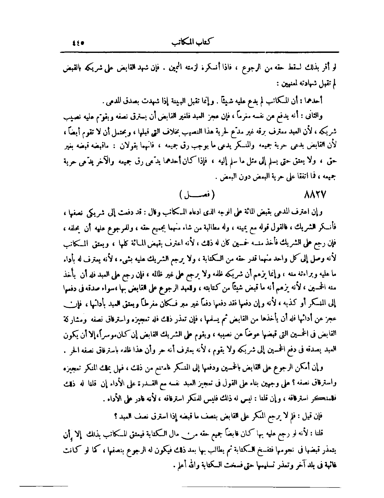 وَإِنْ قُلْنَا: لَيْسَ لَهُ ذَلِكَ. فَلَيْسَ لِلْمُنْكِرِ اسْتِرْقَاقُهُ؛ لِأَنَّهُ قَادِرٌ عَلَى الْأَدَاءِ فَإِنْ قِيلَ: فَلِمَ لَا يَرْجِعُ الْمُنْكِرُ عَلَى الْقَابِضِ بِنِصْفِ مَا قَبَضَهُ، إذَا اسْتَرَقَّ نِصْفَ الْعَبْدِ؟ قُلْنَا: لِأَنَّهُ لَوْ رَجَعَ عَلَيْهِ بِهَا كَانَ قَابِضًا جَمِيعَ حَقِّهِ مِنْ مَالِ الْكِتَابَةِ، فَيَعْتِقُ الْمُكَاتَبُ بِذَلِكَ، إلَّا أَنْ يَتَعَذَّرَ قَبْضُهَا فِي نُجُومِهَا فَتُفْسَخَ الْكِتَابَةُ، ثُمَّ يُطَالَبَ بِهَا بَعْدَ ذَلِكَ، فَيَكُونَ لَهُ الرُّجُوعُ بِنِصْفِهَا، كَمَا لَوْ كَانَتْ غَائِبَةً فِي بَلَدٍ آخَرَ، وَتَعَذَّرَ تَسْلِيمُهَا حَتَّى فُسِخَتْ الْكِتَابَةُ. وَاَللَّهُ أَعْلَمُ.