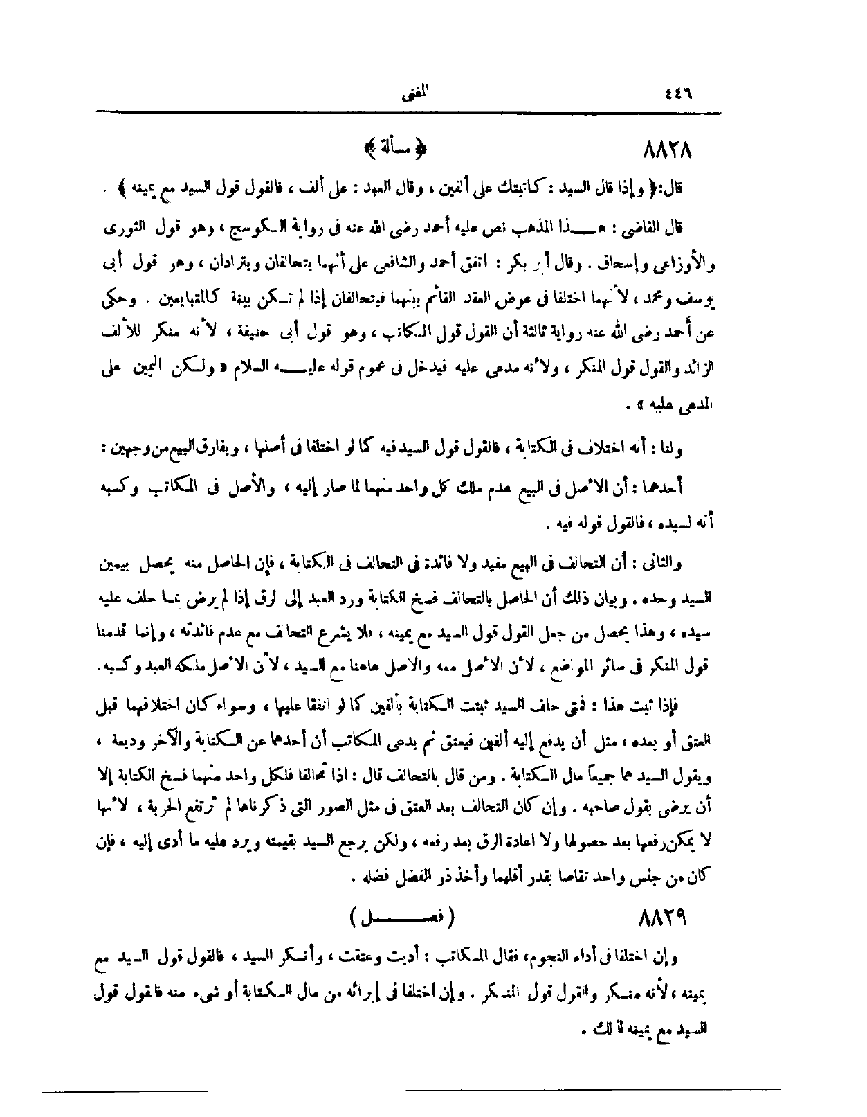 (٨٨١٧) مَسْأَلَةٌ: قَالَ: وَإِذَا قَالَ السَّيِّدُ: كَاتَبْتُك عَلَى أَلْفَيْنِ. وَقَالَ الْعَبْدُ: عَلَى أَلْفٍ. فَالْقَوْلُ قَوْلُ السَّيِّدِ مَعَ يَمِينِهِ قَالَ الْقَاضِي: هَذَا الْمَذْهَبُ. نَصَّ عَلَيْهِ أَحْمَدُ - رَضِيَ اللَّهُ عَنْهُ - فِي رِوَايَةِ الْكَوْسَجِ. وَهُوَ قَوْلُ الثَّوْرِيِّ، وَالْأَوْزَاعِيِّ، وَإِسْحَاقَ. وَقَالَ أَبُو بَكْرٍ: اتَّفَقَ أَحْمَدُ، وَالشَّافِعِيُّ، عَلَى أَنَّهُمَا يَتَحَالَفَانِ، وَيَتَرَادَّانِ. وَهُوَ قَوْلُ أَبِي يُوسُفَ، وَمُحَمَّدٍ؛ لِأَنَّهُمَا اخْتَلَفَا فِي عِوَضِ الْعَقْدِ الْقَائِمِ بَيْنَهُمَا، فَيَتَحَالَفَانِ إذَا لَمْ تَكُنْ بَيِّنَةٌ، كَالْمُتَبَايِعِينَ.