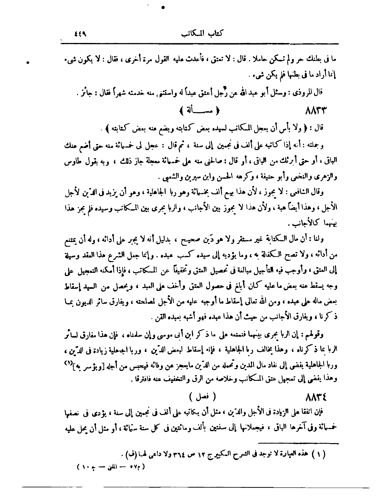 (٨٨٢٢) مَسْأَلَةٌ: قَالَ: وَلَا بَأْسَ أَنْ يُعَجِّلَ الْمُكَاتَبُ لِسَيِّدِهِ بَعْضَ كِتَابَتِهِ، وَيَضَعَ عَنْهُ بَعْضَ كِتَابَتِهِ وَجُمْلَتُهُ أَنَّهُ إذَا كَاتَبَهُ عَلَى أَلْفٍ فِي نَجْمَيْنِ إلَى سَنَةٍ، ثُمَّ قَالَ: عَجِّلْ لِي خَمْسَمِائَةٍ مِنْهُ، حَتَّى أَضَعَ عَنْك الْبَاقِيَ، أَوْ حَتَّى أُبْرِئَك مِنْ الْبَاقِي. أَوْ قَالَ: صَالِحْنِي مِنْهُ عَلَى خَمْسِمِائَةٍ مُعَجَّلَةٍ. جَازَ ذَلِكَ. وَبِهِ يَقُولُ طَاوُسٌ، وَالزُّهْرِيُّ، وَالنَّخَعِيُّ، وَأَبُو حَنِيفَةَ. وَكَرِهَهُ الْحَسَنُ، وَابْنُ سِيرِينَ، وَالشَّعْبِيُّ. وَقَالَ الشَّافِعِيُّ: لَا يَجُوزُ؛ لِأَنَّ هَذَا بَيْعُ أَلْفٍ بِخَمْسِمِائَةٍ، وَهُوَ رِبَا الْجَاهِلِيَّةِ، وَهُوَ أَنْ يَزِيدَ فِي الدَّيْنِ لِأَجْلِ الْأَجَلِ، وَهَذَا أَيْضًا هِبَةٌ، وَلِأَنَّ هَذَا لَا يَجُوزُ بَيْنَ الْأَجَانِبِ، وَالرِّبَا يَجْرِي بَيْنَ الْمُكَاتَبِ وَسَيِّدِهِ، فَلَمْ يَجُزْ هَذَا بَيْنَهُمَا، كَالْأَجَانِبِ.