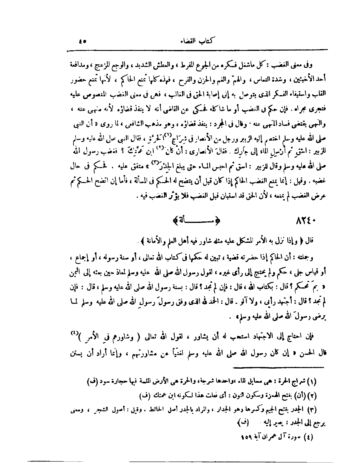 (٨٢٣١) مَسْأَلَةٌ؛ قَالَ: (وَإِذَا نَزَلَ بِهِ الْأَمْرُ الْمُشْكِلُ عَلَيْهِ مِثْلُهُ، شَاوَرَ فِيهِ أَهْلَ الْعِلْمِ وَالْأَمَانَةِ) وَجُمْلَتُهُ أَنَّ الْحَاكِمَ إذَا حَضَرَتْهُ قَضِيَّةٌ تَبَيَّنَ لَهُ حُكْمُهَا فِي كِتَابِ اللَّهِ تَعَالَى، أَوْ سُنَّةِ رَسُولِهِ، أَوْ إجْمَاعٍ، أَوْ قِيَاسٍ جَلِيٍّ، حَكَمَ وَلَمْ يَحْتَجْ إلَى رَأْيِ غَيْرِهِ؛ «لِقَوْلِ رَسُولِ اللَّهِ - صَلَّى اللَّهُ عَلَيْهِ وَسَلَّمَ - لِمُعَاذٍ حِينَ بَعَثَهُ إلَى الْيَمَنِ: بِمَ تَحْكُمُ؟ قَالَ: بِكِتَابِ اللَّهِ. قَالَ: فَإِنْ لَمْ تَجِدْ؟ . قَالَ: بِسُنَّةِ رَسُولِ اللَّهِ - صَلَّى اللَّهُ عَلَيْهِ وَسَلَّمَ -. قَالَ: فَإِنْ لَمْ تَجِدْ؟ . قَالَ: أَجْتَهِدُ رَأْيِي، وَلَا آلُو. قَالَ: الْحَمْدُ لِلَّهِ الَّذِي وَفَّقَ رَسُولَ رَسُولِ اللَّهِ - صَلَّى اللَّهُ عَلَيْهِ وَسَلَّمَ - لِمَا يُرْضِي رَسُولَ اللَّهِ - صَلَّى اللَّهُ عَلَيْهِ وَسَلَّمَ -» .