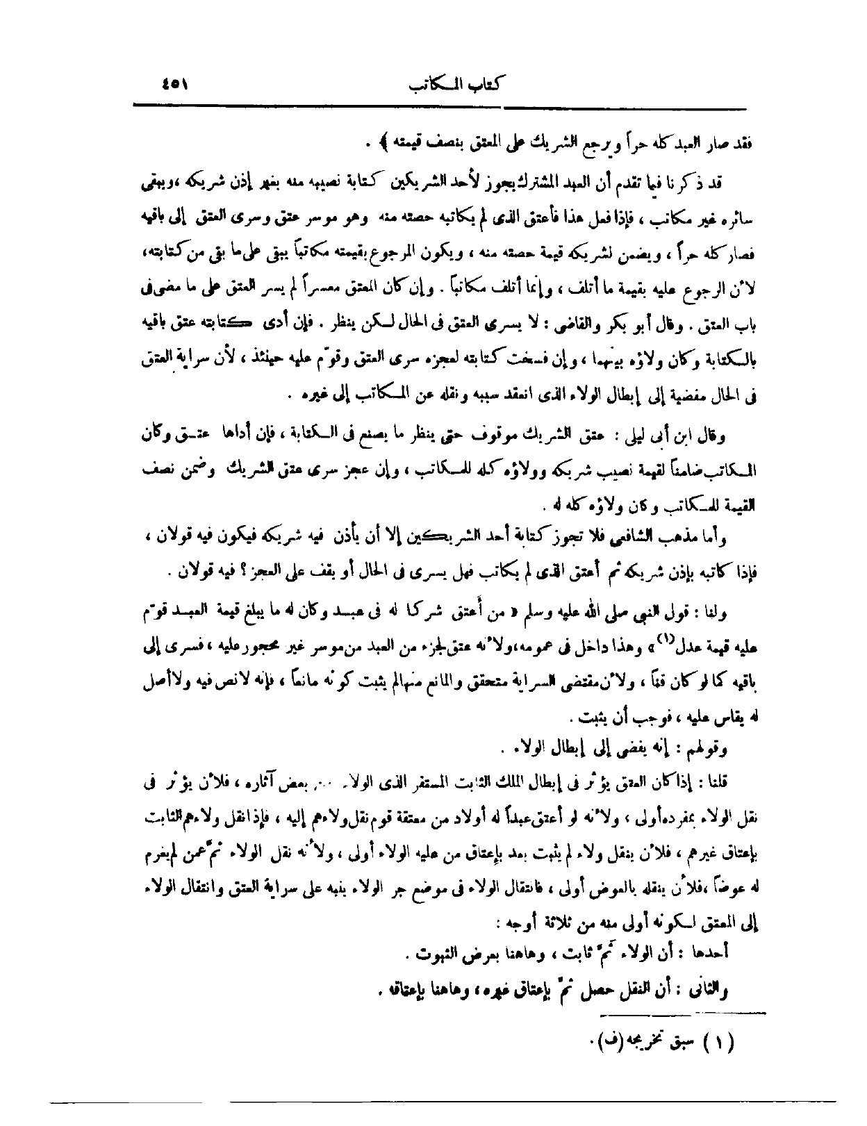 وَقَالَ أَبُو بَكْرٍ، وَالْقَاضِي: لَا يَسْرِي الْعِتْقُ فِي الْحَالِ، لَكِنْ يُنْظَرُ؛ فَإِنْ أَدَّى كِتَابَتَهُ عَتَقَ بَاقِيهِ بِالْكِتَابَةِ، وَكَانَ وَلَاؤُهُ بَيْنَهُمَا، وَإِنْ فُسِخَتْ كِتَابَتُهُ لِعَجْزِهِ، سَرَى الْعِتْقُ، وَقُوِّمَ عَلَيْهِ حِينَئِذٍ؛ لِأَنَّ سِرَايَةَ الْعِتْقِ فِي الْحَالِ مُفْضِيَةٌ إلَى إبْطَالِ الْوَلَاءِ الَّذِي انْعَقَدَ سَبَبُهُ، وَنَقْلِهِ عَنْ الْمُكَاتِبِ إلَى غَيْرِهِ. وَقَالَ ابْنُ أَبِي لَيْلَى: عِتْقُ الشَّرِيكِ مَوْقُوفٌ حَتَّى يُنْظَرَ مَا يَصْنَعُ فِي الْكِتَابَةِ، فَإِنْ أَدَّاهَا، عَتَقَ، وَكَانَ الْمُكَاتِبُ ضَامِنًا لَقِيمَةِ نَصِيبِ شَرِيكِهِ، وَوَلَاؤُهُ كُلُّهُ لِلْمُكَاتِبِ. وَإِنْ عَجَزَ، سَرَى عِتْقُ الشَّرِيكِ، وَضَمِنَ نِصْفَ الْقِيمَةِ لِلْمُكَاتِبِ، وَكَانَ وَلَاؤُهُ كُلُّهُ لَهُ. وَأَمَّا مَذْهَبُ الشَّافِعِيِّ فَلَا يُجَوِّزُ كِتَابَةَ أَحَدِ الشَّرِيكَيْنِ، إلَّا أَنْ يَأْذَنَ فِيهِ شَرِيكُهُ، فَيَكُونَ فِيهِ قَوْلَانِ، فَإِذَا كَاتَبَهُ بِإِذْنِ شَرِيكِهِ، ثُمَّ أَعْتَقَ الَّذِي لَمْ يُكَاتِبْ فَهَلْ يَسْرِي فِي الْحَالِ، أَوْ يَقِفُ عَلَى الْعَجْزِ؟ فِيهِ قَوْلَانِ. وَلَنَا، قَوْلُ النَّبِيِّ - صَلَّى اللَّهُ عَلَيْهِ وَسَلَّمَ -: «مَنْ أَعْتَقَ شِرْكًا لَهُ فِي عَبْدٍ، وَكَانَ لَهُ مَا يَبْلُغُ قِيمَةَ الْعَبْدِ قُوِّمَ عَلَيْهِ قِيمَةَ عَدْلٍ» . وَهَذَا دَاخِلٌ فِي عُمُومِهِ، وَلِأَنَّهُ عِتْقٌ لَجُزْءٍ مِنْ الْعَبْدِ مُوسِرٍ، غَيْرِ مَحْجُورٍ عَلَيْهِ، فَسَرَى إلَى بَاقِيهِ، كَمَا لَوْ كَانَ قِنًّا، وَلِأَنَّ مُقْتَضَى السِّرَايَةِ مُتَحَقِّقٌ، وَالْمَانِعُ مِنْهَا لَمْ يَثْبُتْ كَوْنُهُ مَانِعًا؛ فَإِنَّهُ لَا نَصَّ فِيهِ، وَلَا أَصْلَ لَهُ يُقَاسُ عَلَيْهِ، فَوَجَبَ أَنْ يَثْبُتَ.